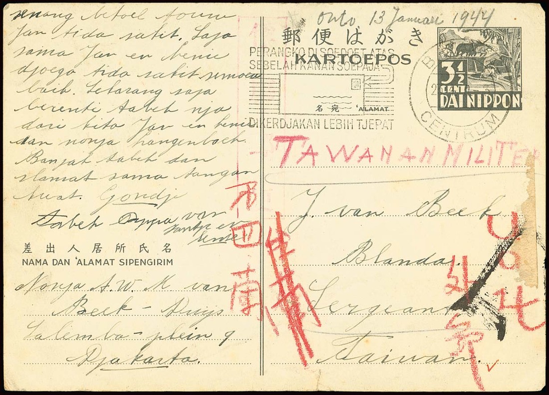 To Taiwan: 1943 (26 Apr.) 3½c. Dai Nippon stationery card to J. van Beck cancelled by Batavia slogan cancellation, marked "tawanan militer" in red crayon with crayon characters for Taipei External and No.4 Holland; received 1944 (13 Jan.). Rare mail to Taiwan. Photo