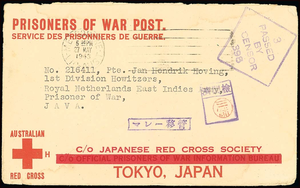 Palembang Camp: 1943 (27 May) Australian Red Cross envelope to Jan Hoving, bears Melbourne machine postmark, Australian censor tape with diamond "398" handstamp, addressed to Java and bears small boxed Censored handstamp with Marai seal and a good strike of boxed Transferred to Malaya; fine.