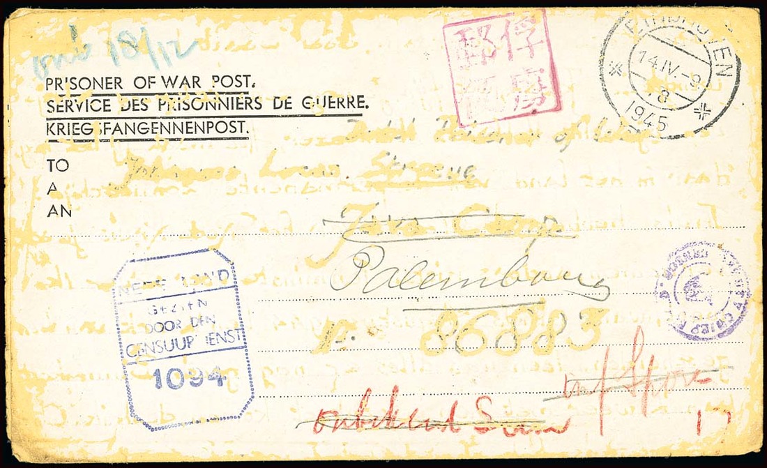 Palembang Camp: 1945 (14 Apr.) German P.O.W. lettersheet cancelled by Eindhoven c.d.s. and addressed to J. Streuve, Java Camp; bears Dutch censor "1094", circular Egyptian censor and boxed Prisoner of War Post handstamp in red, Singapore and Siam have been crossed through and Palembang added; the ink has eaten in to the surface covering of the paper, nevertheless an interesting cover. Tett 2-6-14