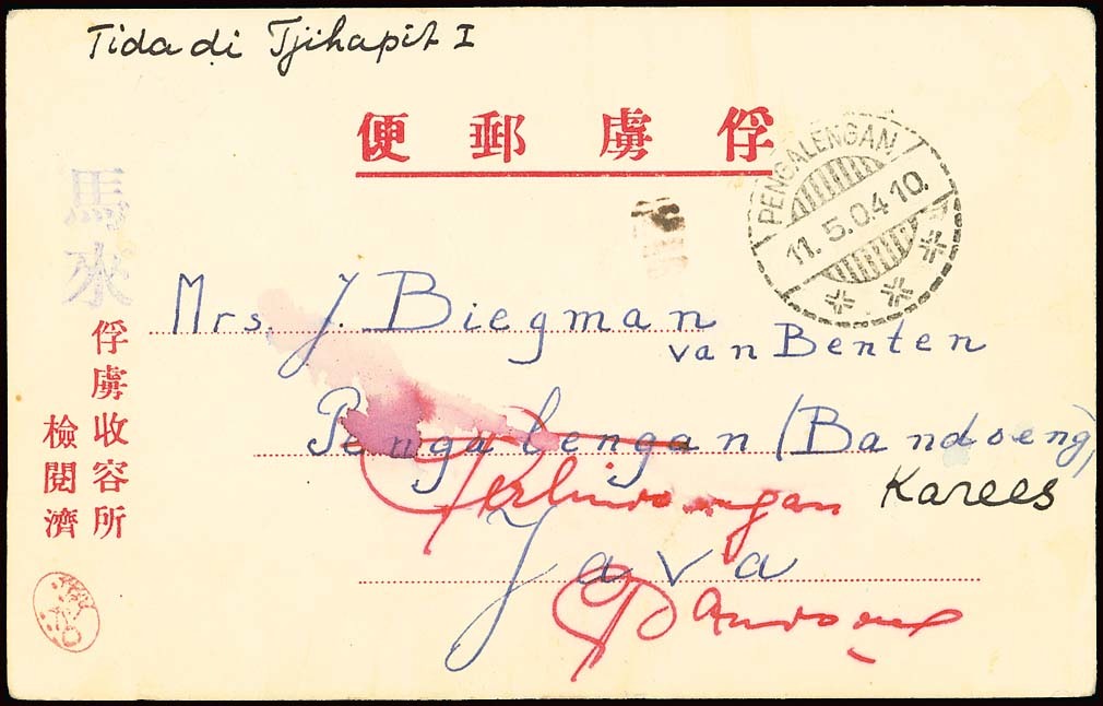 To Java: 1944 first type card from van Wynen to his aunt in Java, bearing large figures Marai in pale violet-blue and Asanuma seal, redirected on arrival with Pengalengan c.d.s. (11.5) and manuscript Not Known in Tjihapit. Fine. Tett fig. 2-7-4. Photo