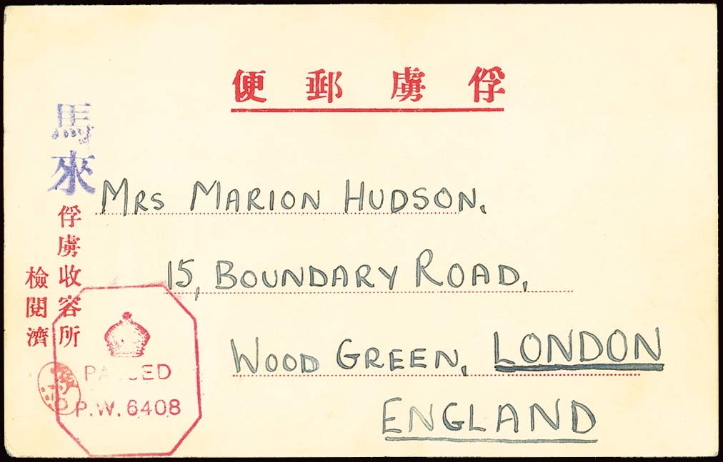 To U.K.: 1943 (c.) first type card from Edward Hudson to his mother in London, bearing large figures Marai and Asanuma seal, British censor handstamp "P.W.6408"; the reverse with the date of receipt, "July 4th 1944". Fresh and fine. Tett fig. 2-7-3. Photo