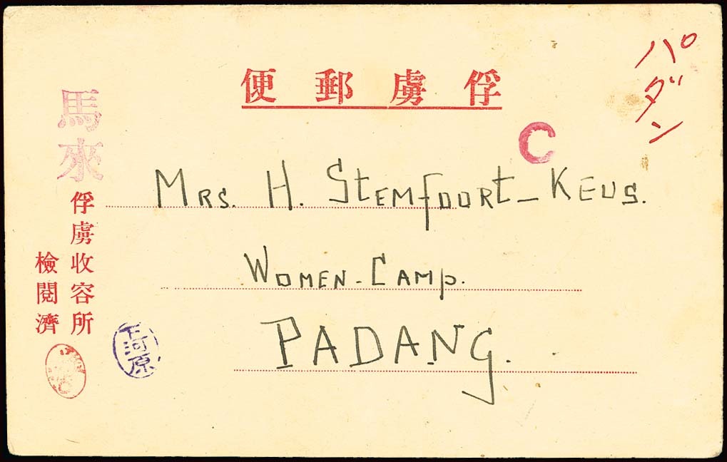 Within Sumatra: 1943 (c.) first type card from Capt. J.W. Stemfourt to his wife in Padang Women's Camp, with large characters Marai in red with Asanuma seal with Shimogahara seal in violet alongside, there is also a large handstruck "C" in red and Japanese characters. This card was sent via Singapore for transit between two camps in Sumatra. Photo
