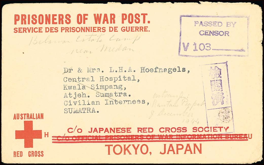 From Australia: 1943 Australian Red Cross envelope to Mrs L. Hoefnagels, addressed to Central Hospital, Kwala Simpang, bearing Australian censor tape with boxed censor handstamp "V103"; boxed Censored handstamp in purple with small, unidentified seal in purple, manuscript "Belawan Estate Camp near Medan" and "Ontvangen (received) Rantau Prapat 8th December 1944". Tett fig. 2-6-15. Photo