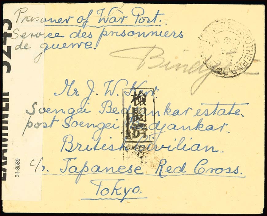 From U.K.: 1943 (8 Mar.) "Prisoner of War Post" envelope to J.W. Kerr, bearing Edinburgh c.d.s., British censor seal "5243", a good strike of the boxed Censored handstamp in black with Shindo seal and manuscript "Bindjei"; small pencil note on the reverse, "5 Dec 1944".Tett fig. 2-6-16