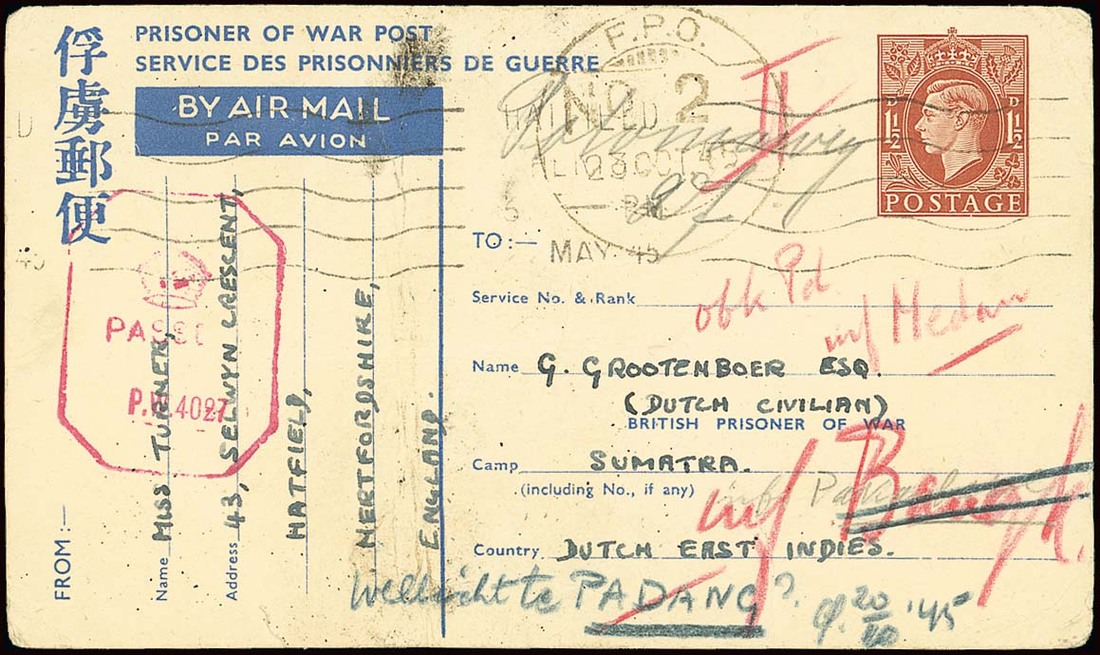 From U.K.: 1945 (21 May) 1½d. Prisoner of War Post air mail card to G. Grootenboer, cancelled by Hatfield roller cancellation, British censor handstamp "P.W.4027" with numerous manuscript markings indicating the attempts to find the recipient with Padang (20.9), Medan, Palomanvry, Indian Army Post Office No.2 c.d.s (23.10) and, on the reverse, boxed handstamp, Unknown by the Netherlands Information Office in Singapore; some light creasing. A scarce card with a lot of character. Tett fig. 2-6-24. Photo