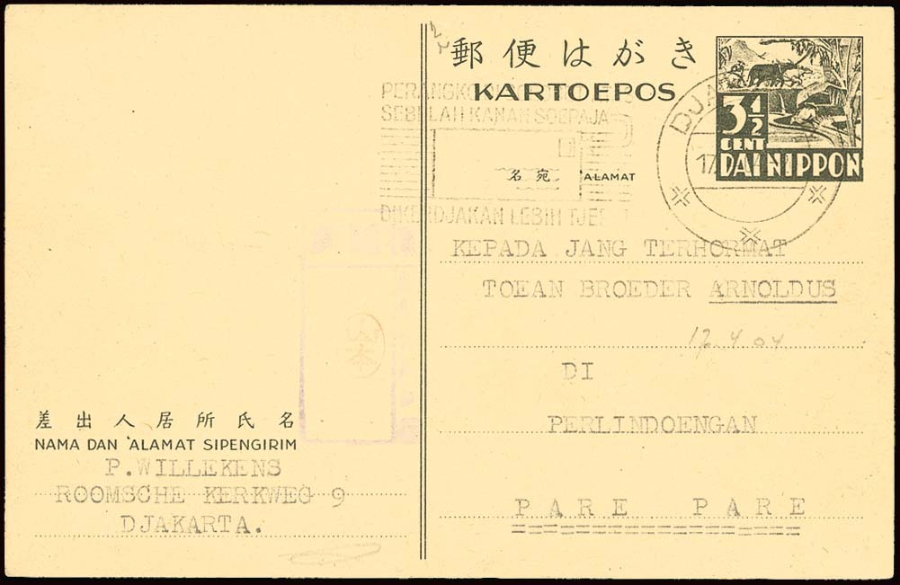 1944 (17 Apr.) Dai Nippon 3½c. stationery card to Father Arnoldus in Pare Pare, cancelled by Jakarta slogan postmark and bearing a light strike of Jakarta Prisoner of War Camp Censored handstamp in purple with Yamamoto seal. Fine and very scarce. Tett fig. 2-8-6. Photo