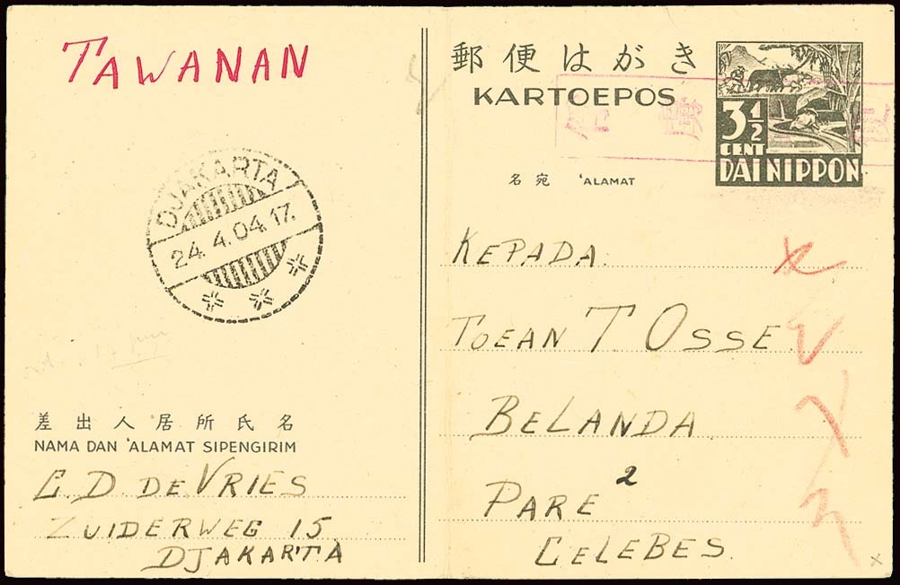 1944 (24 Apr.) Dai Nippon 3½c. stationery card to Toean Osse in Pare Pare from Jakarta bearing despatch c.d.s. at left, boxed Prisoner of War Post handstamp in rose-red and with Serebesu (Celebes) in katakana in red crayon and "Tawanan"; vertical fold. Very scarce. Tett fig. 2-8-5. Photo