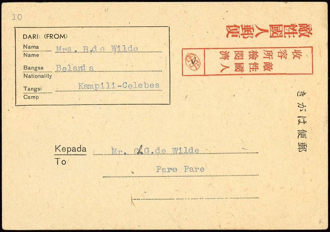 Kampili Camp: 1944 (c.) special P.O.W. card for civilians from Mrs de Wilde to her husband in Pare Pare, bearing Tanaka seal; very fine. Also the equivalent Prisoner or War card from George Cortenbach to a relative in Soerabaja, with Ogiri seal, the camp name has been censored out; this card quite damaged at top. A good pair of rare cards. Tett fig. 2-8-9. Photo