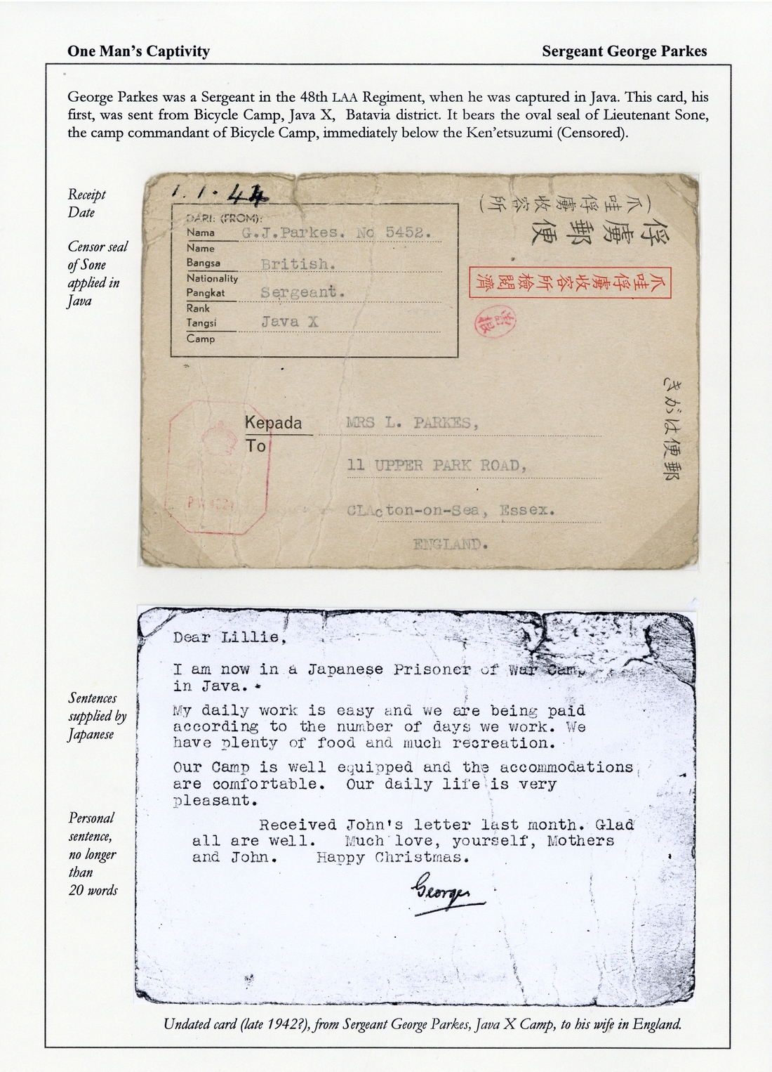 Sergeant George Parkes of the 48th LAA Regiment: 1942-45, the collection of mail between the P.O.W. and his family with his first card from Camp X in Java, 1942 letter from his son, which appear to be the first he received, various communications from the War Office to his wife with regard to his whereabouts and pay, 1943 Red Cross letter informing his wife of the information from a radio broadcast and a later letter listing the regulations about sending mail, 1943 letter from home, now redirected to Palembang, with additional letters, two 1944 letters with manuscript "M" on the cover for Malaya (also on Sumatra mail), two 1944 3d. air mail cards with boxed Transferred to Malaya, 1944 second type P.O.W. card to his wife from "Malayan P.O.W. Camps", 1944 Red Cross letter inviting Mrs Parkes to send a telegram, 1945 telegram from his wife to his mother advising that George was safe and in Singapore and finally 1½d. Forces lettersheet sent from the repatriation ship 'Antenor'. A very interesting collection, especially with the Red Cross and Official letters. Reference Tett 2-9-1 to 10