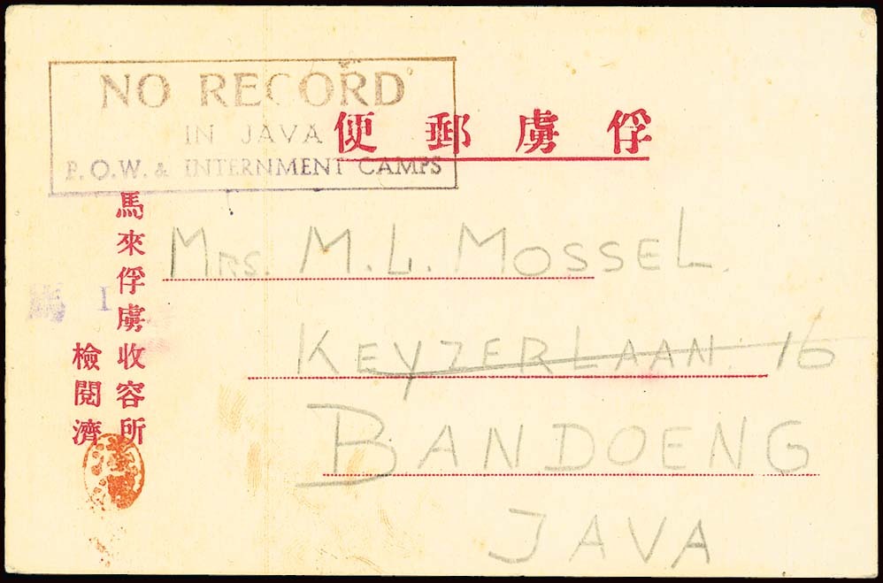1944 second type P.O.W. card from J. Mossel to his wife in Bandoeng, Java, bearing handstruck Ma I and Asanuma seal with a good strike of boxed "no record/in java/p.o.w. & internment camp" in black. Fine. A scarce card from Pakan Baroe, Sumatra. Tett fig. 2-7-12. Photo