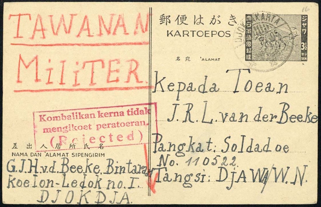 1945 (19 May) 1945 3½c. stationery card to J. van der Beeke in Java W.N. Camp, cancelled by Jakarta c.d.s. and with "tawanan militer" in red crayon, sent from Djokdja Camp and bears the boxed Return to Sender "Rejected" handstamp in carmine; fine. Tett fig. 2-13-1