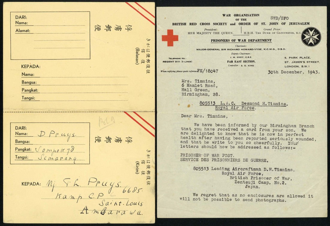 A selection of items which includes a group of messages to Mrs Timmins in Birmingham with three Red Cross messages following the tracing of her son plus an unhelpful letter from the Record Office; a request for release of a Dutch national; internee registration card and a group of unused stationery including P.O.W. card and a very scarce unsplit P.O.W. reply card. A good lot. (13 items). Photo