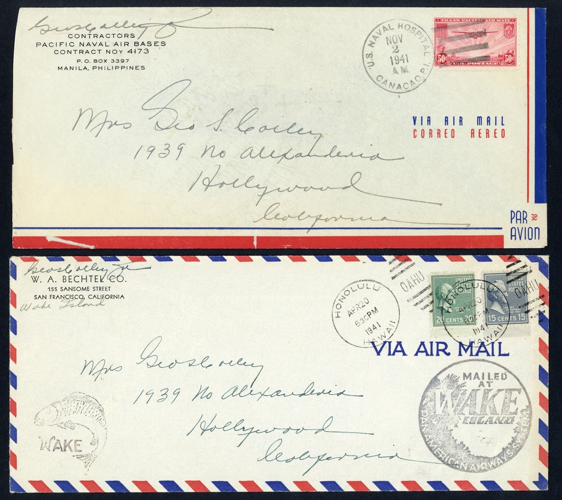 1941 (20 Apr.) air mail envelope from George Colley to his wife in Hollywood, Los Angeles, mailed from Wake Island with 35c. franking tied by Honolulu duplex; also 1941 (2 Nov.) air mail envelope from the same correspondence bearing U.S. air 50c. tied by "u.s. naval hospital/canacao" duplex. (2 covers)