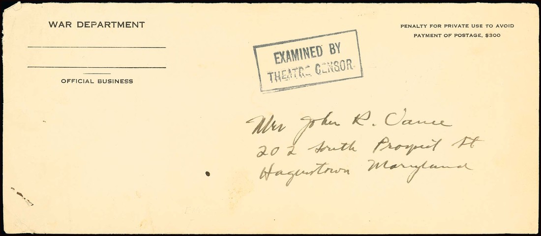 1942 (Mar.) (c.) War Department envelope from Col. John Vance to his wife in Maryland, bears boxed "examined by/theatre censor", without any other marking. This handstamp was used in Melbourne in April 1942, suggesting that this letter was taken by submarine to enter the postal system in Melbourne. A very unusual military letter. Photo