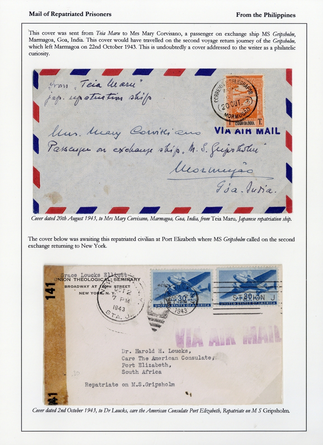 1943 a group of covers addressed to passengers on the second exchange with censored envelope from Valley Center, Kansas to Alice Huggins, New York (ex Fiset); from New York to Harold Loucks, Port Elizabeth; and from Portuguese India to Mary Corvisano at Goa (philatelic). An unusual selection. Tett figs. 5-13-3, 4. (3 covers)