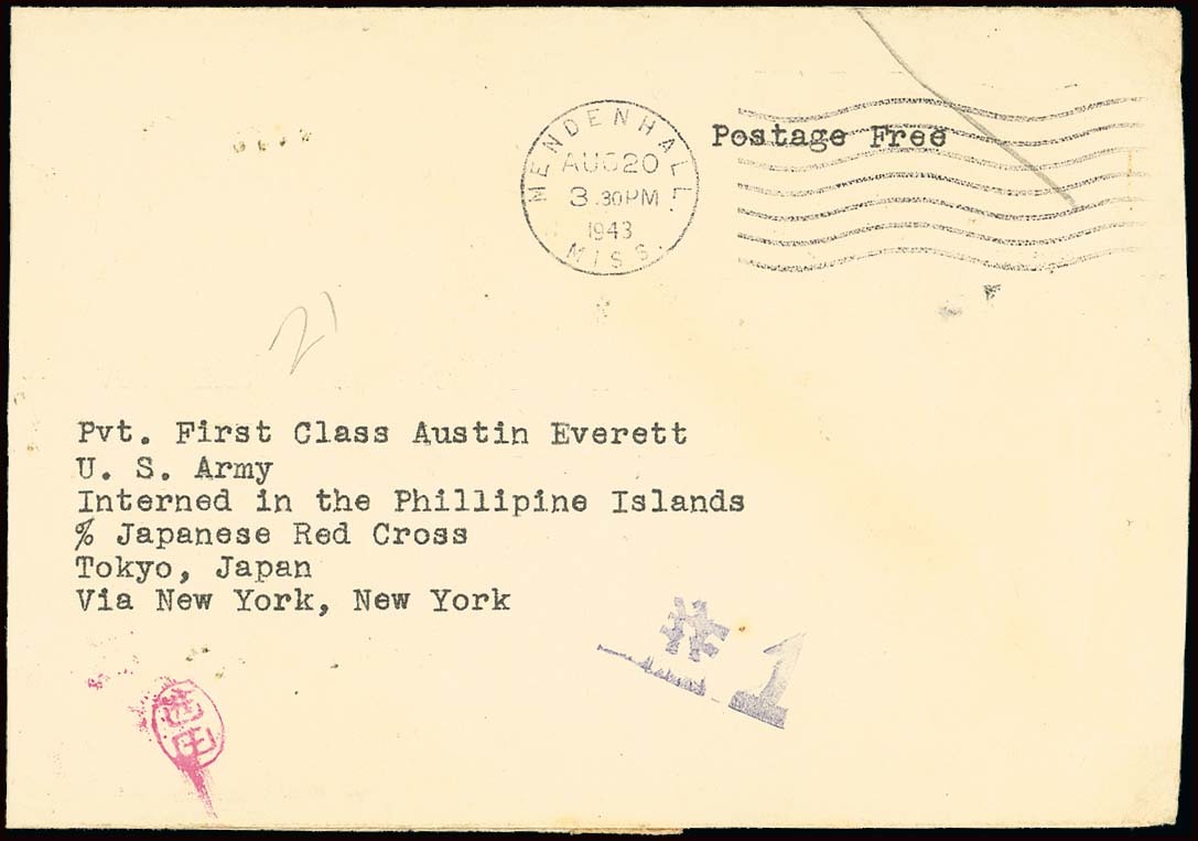 1943, a group of U.S. covers with 1943 (1 Apr.) envelope to Robin Fisher bearing San Francisco slogan postmark, U.S. censor tape, Philippine Prisoner of War Camp Censor handstamp with Hatarei seal and "Camp #1" in red crayon; 1943 (10 May) cover to Carl Shaw bearing Branson duplex, Philippine Prisoner of War Censor handstamp in mauve with Shosa seal and pencil "#1"; 1943 (30 June) to Wayne Pennington bearing Drumright duplex, circular Tokyo Red Cross handstamp in rose, boxed Prisoner of War Mail in red, Philippine Prisoner of War Camp Censor handstamp in rose with Shoda seal, "C1" in blue crayon and pencil "July 31 1944" date of receipt; 1943 (20 Aug.) long envelope (folded) to Austin Everett bearing Hendenhall machine postmark. handstruck "#1" in blue-black (unusual) and Nishida seal; 1943 (25 Aug.) envelope to Myron Hayes with Cambridge machine postmark and handstruck "CAMP-1" in blue-black, without Japanese censor; and 1943 (2 Sept.) envelope to Joseph Wolf bearing St. Marys duplex and marked "Via Gripsholm", Nishida seal and "#1" in blue crayon and part additional censor seal at right. A good and varied group. Tett figs. 5-3-8, 9, 14, 22, 23, 24. (6 covers). Photo