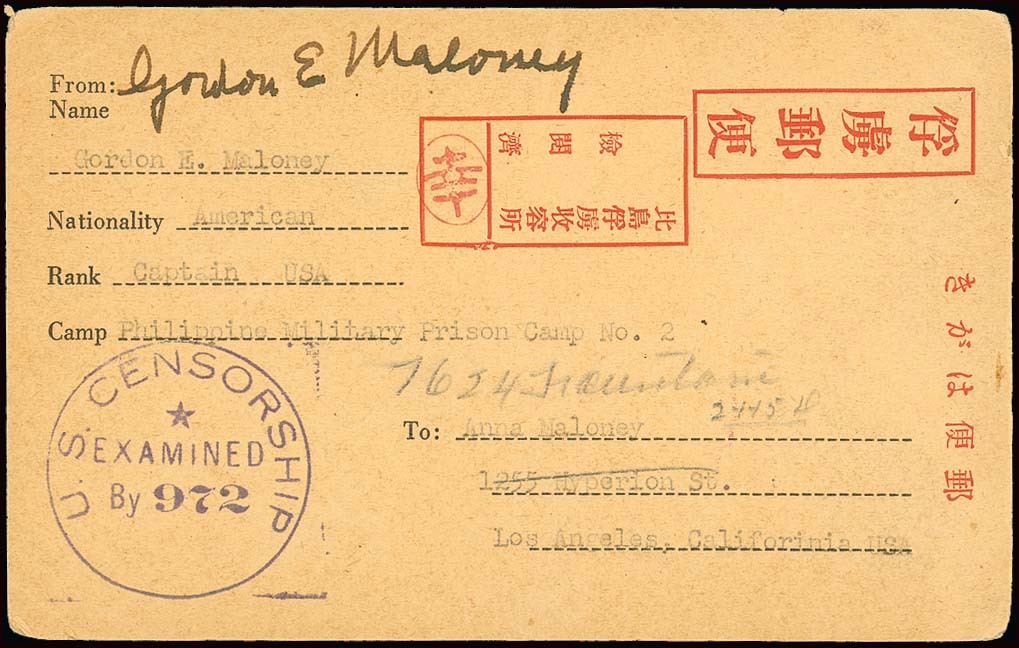 1943 (c.) type 2 card from Gordon Malonay to his sister in Los Angeles bearing Sachi seal and circular U.S. censor handstamp "972"; good. Tett fig. 5-2-16. Photo