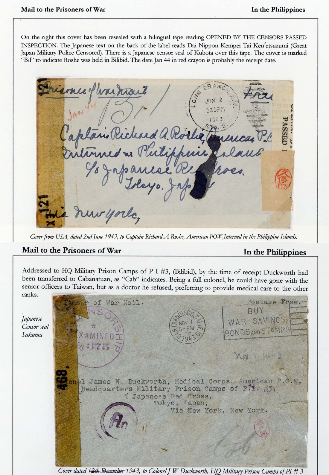 1943, two envelopes, 1943 (2 June) to Capt. Richard Roshe bearing Long Branch duplex, U.S. censor tape and Great Japanese Military Police Censored tape with Kubota seal, manuscript "Bil" and "Jan 44" (receipt); 1943 (1 Nov.) to Col. James Duckworth, Medial Corps., Camp of P.I. #3, bearing San Francisco slogan postmark, U.S. censor tape and circular handstamp "375", circular German censor handstamp, Japanese censor seal and "Cab" (he had been transferred to Cabanatuan) (ex. Garrett). Tett fig. 5-3-10. (2 covers)