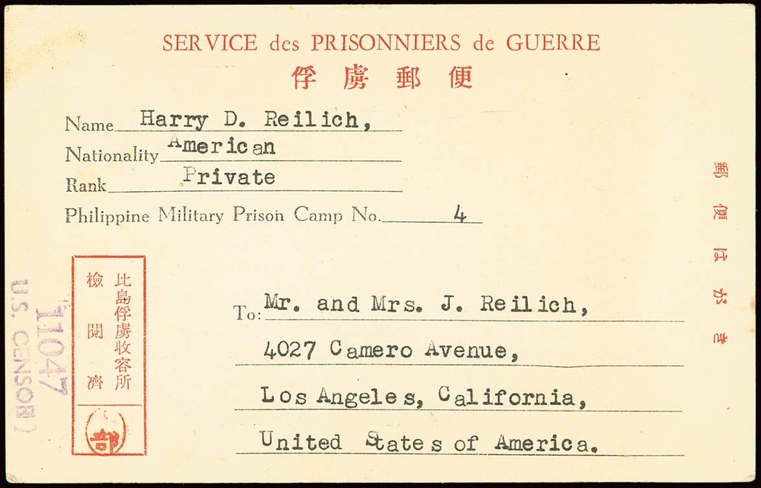 1944 type 3 and type 4 cards from Harry Reilich to his parents in Los Angeles, both with Urabe seal and U.S. censor handstamp "11047"; the first is creased, the second fresh and fine. Tett figs. 5-2-29, 36. Photo