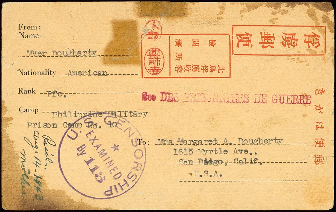 1942 (Dec.) (?) type 1 card from Myer Dougherty to his mother in San Deigo bearing straight-line "sec des prisonniers de guerre" in red, Yakushiji and Urabe seals, circular U.S. censor "113" and manuscript "Rec'd Aug 14 - 1943"; stained and soiled. Very rare and only two items of mail are recorded from this camp. Tett fig. 5-2-13. Photo
