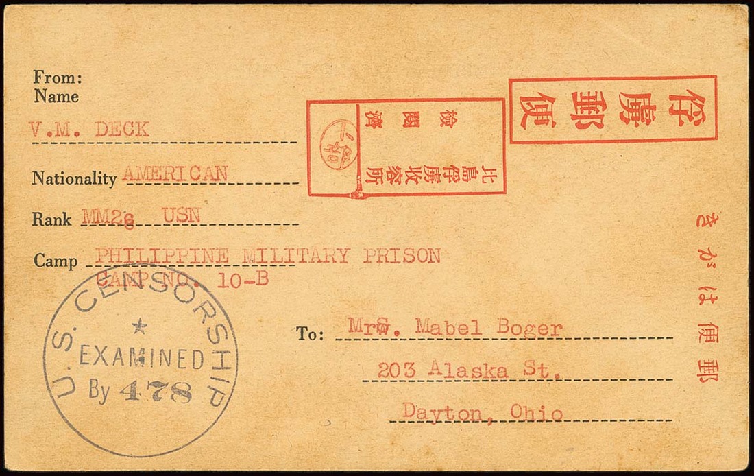 1943 type 2 card from V.M. Deck to a friend (aunt?) in Dayton, Ohio bearing Urabe seal and circular U.S. censor handstamp "478"; typed in red ink (typical for this camp). Fine and rare. Ex Garrett. Tett fig. 5-2-20. Photo