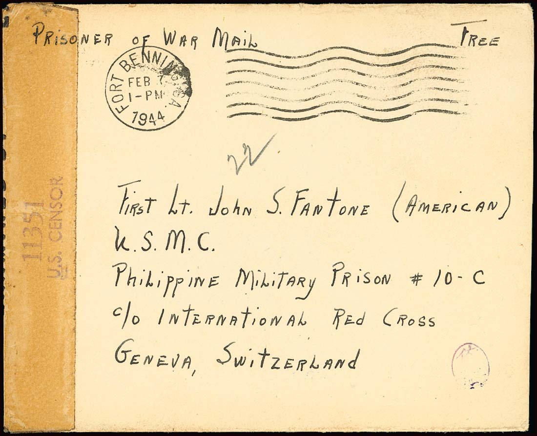1944 (7 Feb.) "Prisoner of War Mail" to Lieut. John Fantone, c/o Geneva, Switzerland bearing Fort Benning machine postmark, U.S. censor tape with "11351" handstamp and faint Sakuma seal in violet and manuscript "22". Good and a very scarce destination. Tett fig. 5-3-40. Photo
