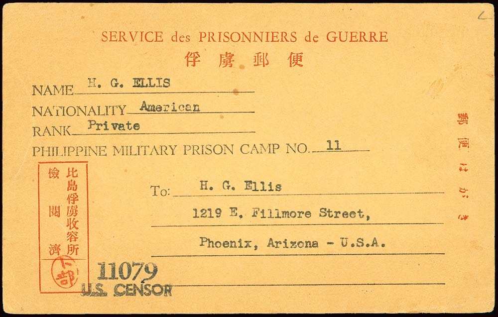 1944 type 3 card from H.G. Ellis to his family in Phoenix, bearing Urabe seal and U.S. censor handstamp "11079"; fine and scarce. Tett fig. 5-2-34. Photo