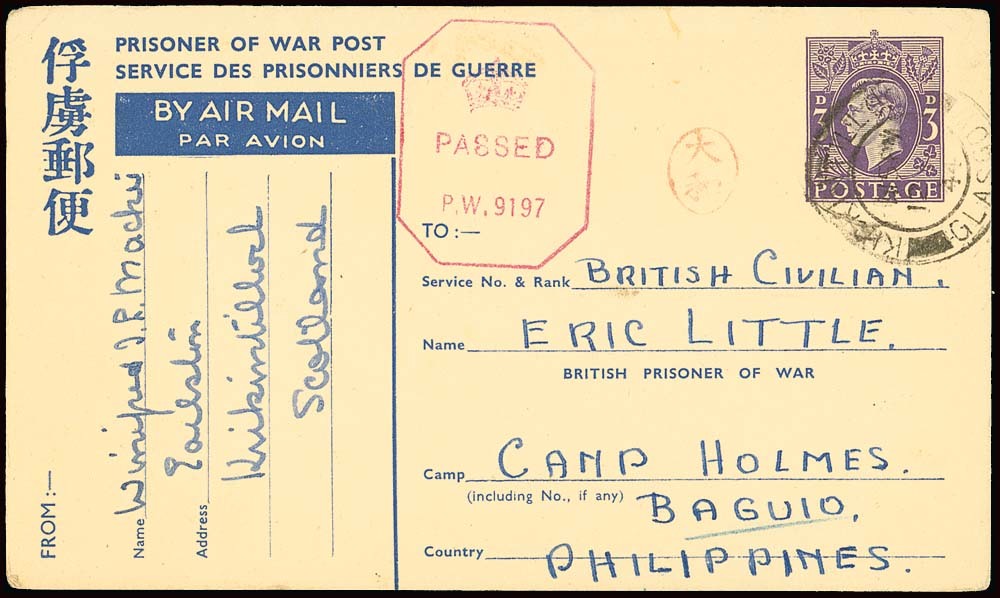 1944 (12 June) 3d. Prisoner of War Post Air Mail card to Eric Little, cancelled by Kirkin Tilloch, Glasgow c.d.s. with British censor "P.W.9197" handstamp in red and Yamato seal; fine. Rare mail from the U.K. Tett fig. 5-5-21. Photo