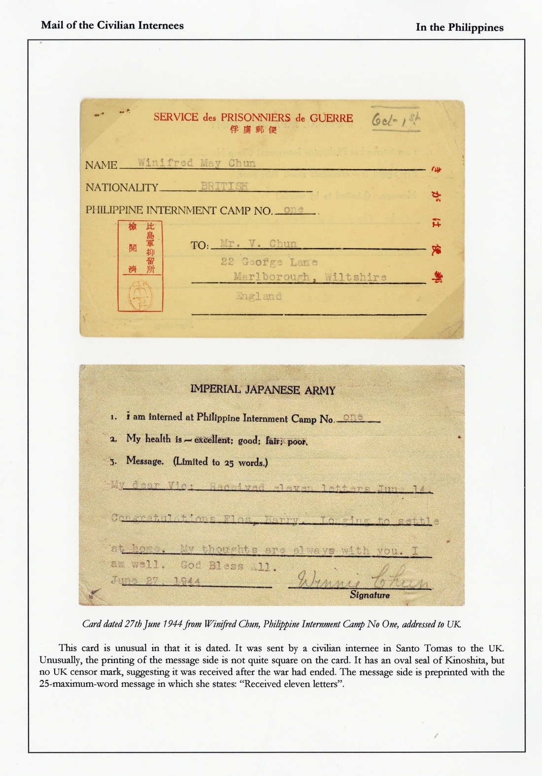 1944 (27 June) Philippine Internment Camp card from Winifred Chun to her brother in Marlborough, England bearing Kinoshita seal and with pencil "Oct 1st"; without British censor so probable received after the war. Also 1942 (2 Nov.) envelope to Miss Chun bearing Marlborough machine postmark, British censor seal "1549", circular Stamp of Enemy Country Person Prisoner of War Camp in black; with the original letter number 2 from her brother and 1944 (1 Dec.) American Red Cross Civilian Message Form to Winnie Chun sent from New York from a friend, this was probably still in transit when Miss Chun was liberated. An interesting group. Tett figs. 5-4-17, 5-5-7, 22. (3 items)