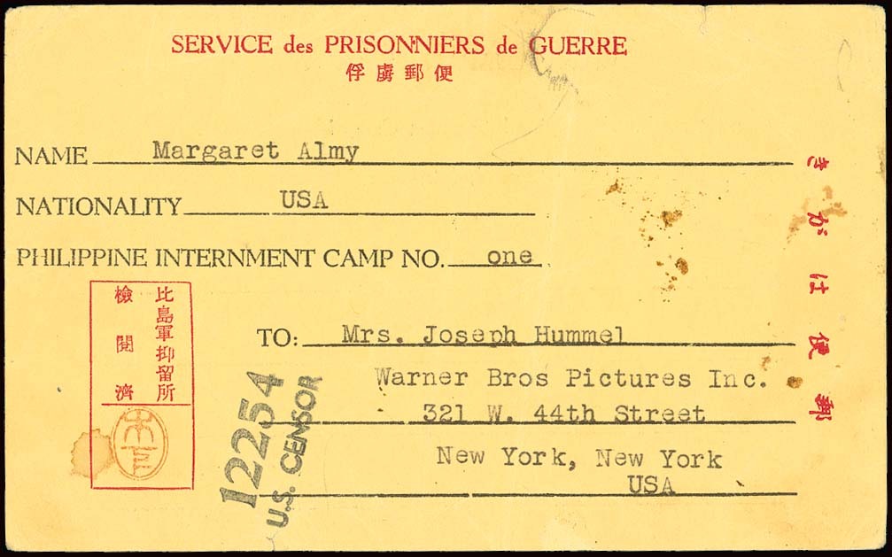 1944 (24 July) Philippine Internment Card from Margaret Almy to a friend at Warner Bros Pictures, bearing Kinoshita seal and U.S. censor "12254" handstamp; some light creasing. Tett fig. 5-4-18. Photo