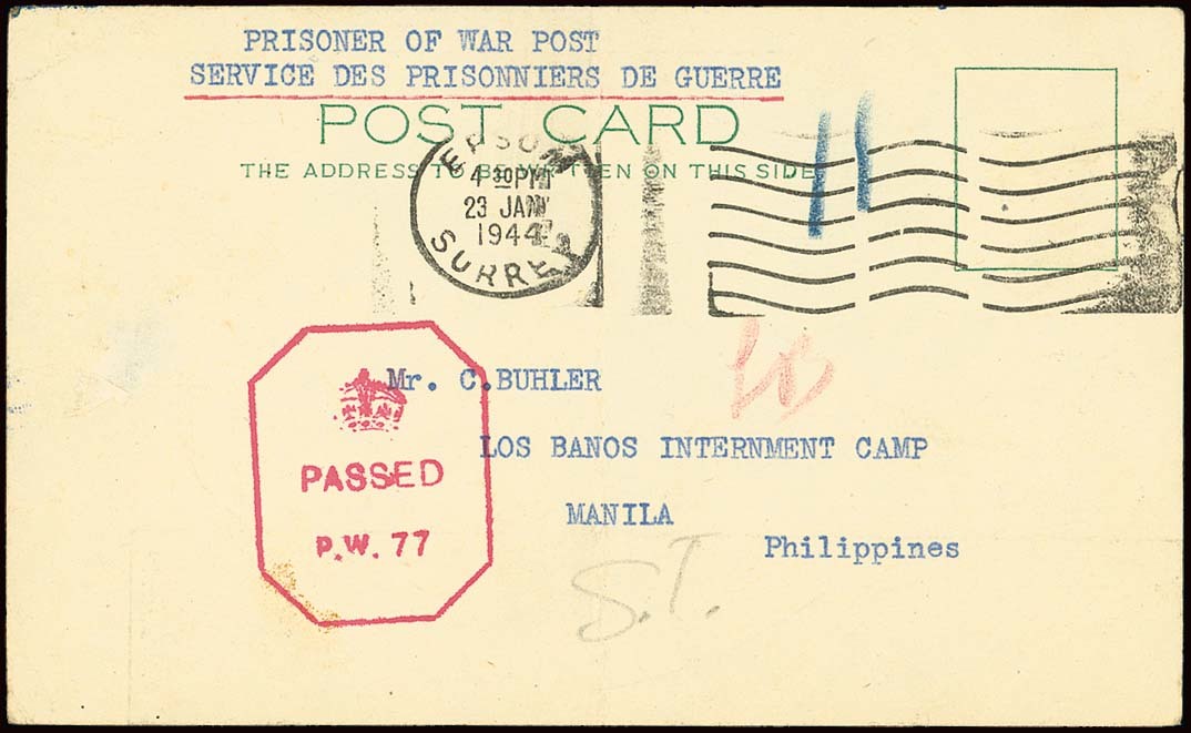 1944 (23 Jan.) plain post card to C. Buhler bearing Epsom machine postmark, British censor "P.W. 77" handstamp in red, various manuscript marks including "LB" in red crayon; light vertical fold. Photo