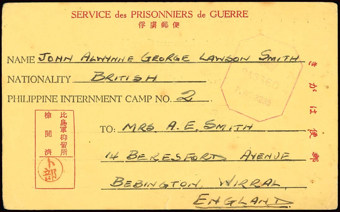 1944 (21 Mar.) Philippine Internment Card from John Alwynne G.L. Smith to his wife in Wirral, the message is upbeat but asks for woollen socks, with Urabe seal and British censor "P.W. 3235" in red; a second card includes, "lucky able to send third card,", Tanaka Eiji seal and British censor "P.W. 3154" in red. Two good cards. Also 1941 (24 Dec.) Cable and Wireless illustrated telegram from Alwynne Smith to Annie Smith stating, "safe in Manila Merry Xmas", sent nine days before the Japanese took Manila. Tett figs. 5-4-11, 15, 5-5-2. (3 pieces). Photo