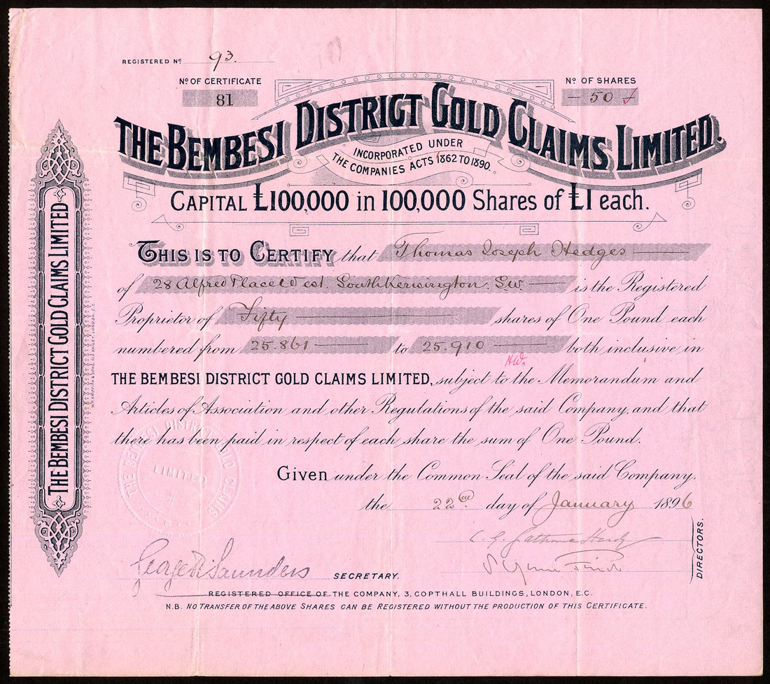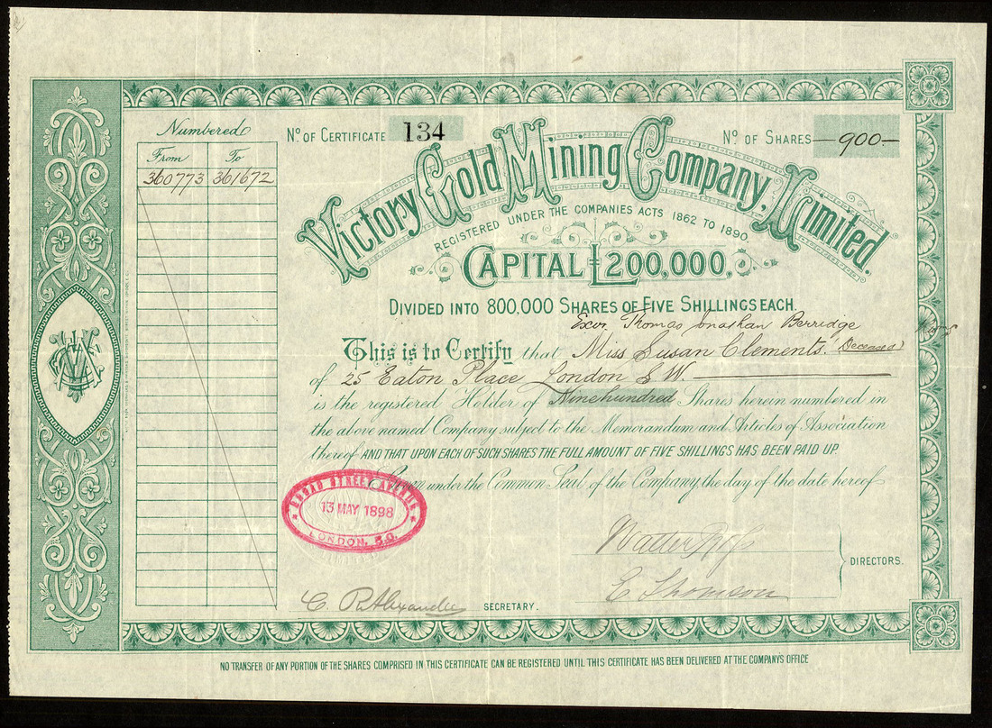 A group of mainly gold mining certificates from Rhodesia, Russia, Mozambique, Australia and South America, including Bembesi District Gold Claims Ltd., 189[6], black on pink paper; East Gwanda Mines Ltd., 190[5]; Victory Gold Mining Co. Ltd., 1898; Victory Ltd., 1886; New Gold Fields Syndicate Ltd., 1895; Loddon Valley Goldfields Ltd., 190[1]; Zapopan Mines Ltd., 189[5], and Lena Goldfields Ltd., 5 shares, [1919], green, with coupons, mixed condition but many very fine and a useful lot. (17)