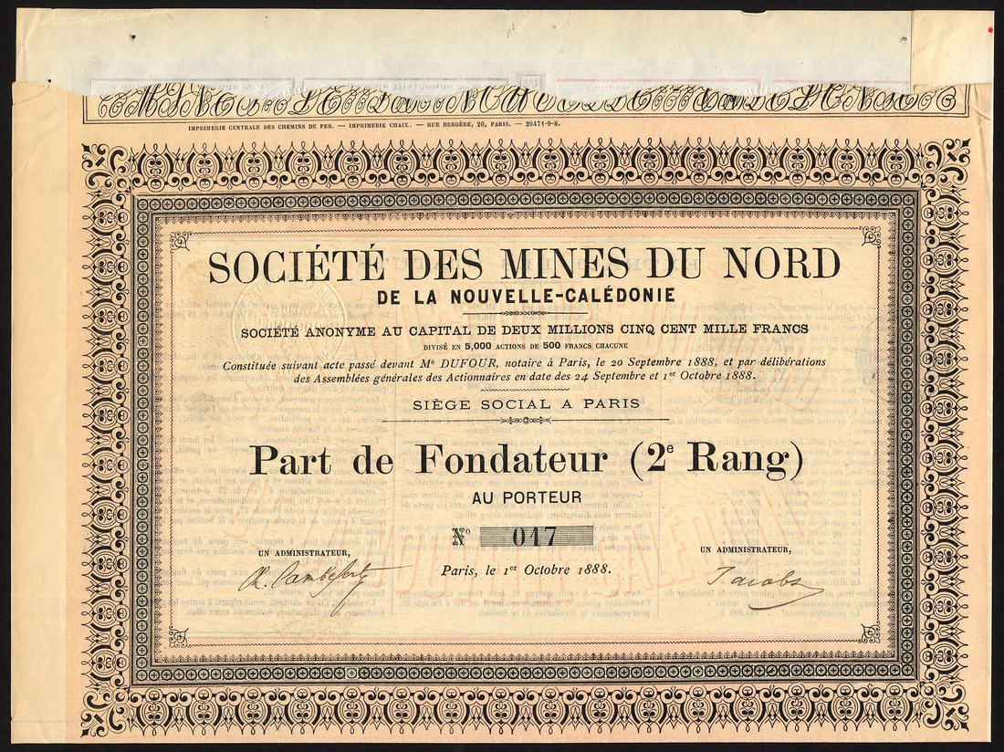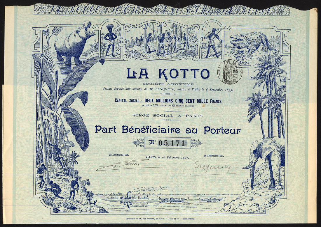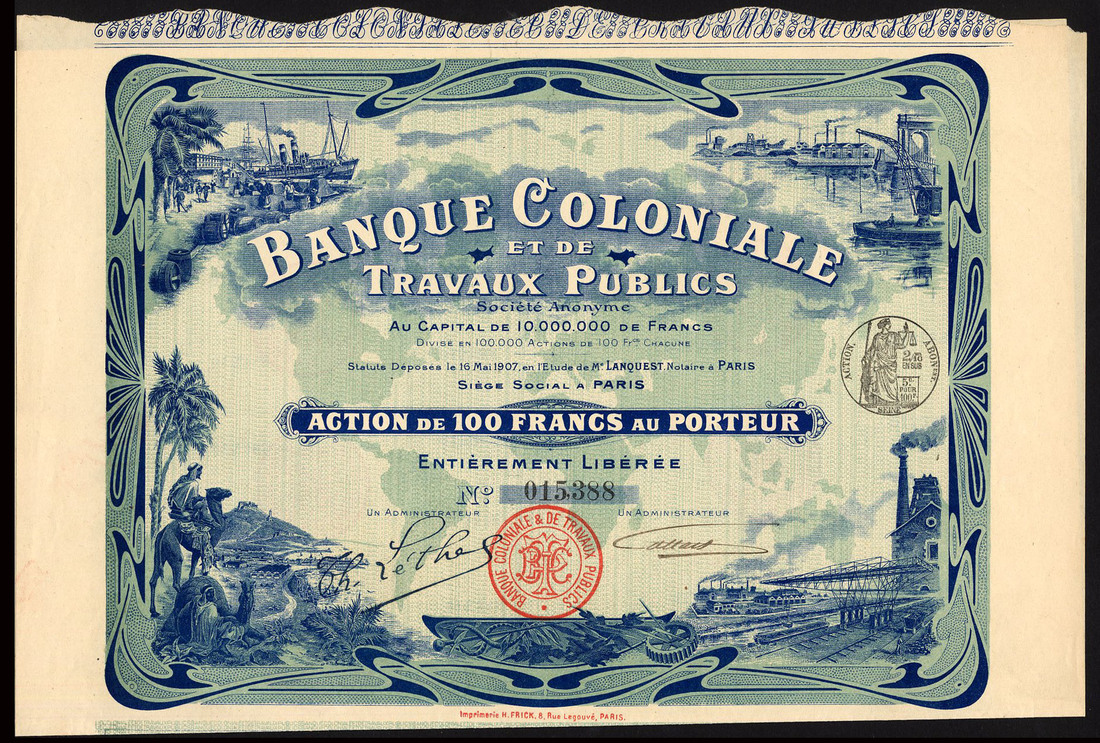 A collection of Belgian and French Colonial Africa certificates comprising, Banque Coloniale et de Travaux Publics, 100 franc bearer share, no.015388, ornate border and vignettes of steam ship at port, docks, canal and factory and natives with camels, blue and green, with coupons, together with 15 more French colonial certificates comprising; Societe des Mines du Nord, 1888; La Kotto S.A., 1907; Compagnie Bordelaise des Comptoirs Africains; Compagnie Miniere des Petroles de Madagascar, 1925; Societe Miniere & Fonciere du Bandama, [1912]; D'elevage et D'alimentation de Madagascar, 1897; Societe Generale des Comptoirs Franco-Africains; Savana Societe Industrielle, Commerciale et Financiere, 1952; L'union Fonciere, 1896; Societe Auxiliare de la Regie des Alcools en Ethiope S.A.; and Compagnie Imperiale Chemins de Fer Ethiopens, 1899, S.A. La Lulonga, dividend share to bearer, 1898, no.0062, vignette of river and dwellings, large palm trees, black with pink underprint, together with; Societe Anversoise du Commerce au Congo, bearer share without par value, 1897, no.4849, brown; Anglo-African Produce Company S.A., ordinary shares, no.231, and others (4) about very fine to extremely fine. (23)
