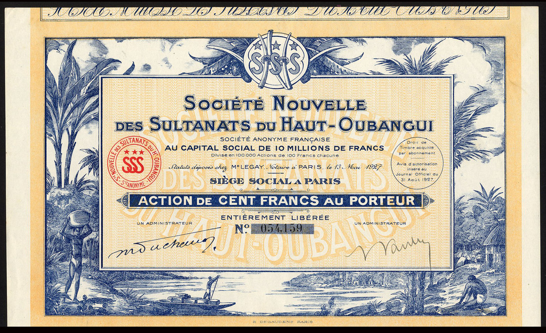 Société Nouvelle des Sultanats du Haut-Oubangui, 10 certificates for 100 franc shares, Paris 1927, attractive pieces with border vignette of natives carrying and transporting goods, palm trees and waterfront, blue and yellow, all with coupons, about extremely fine. (10)
