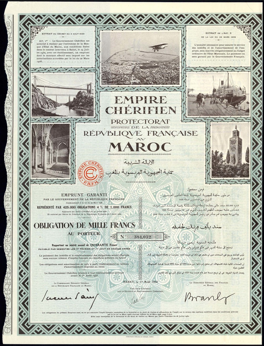 Empire Cherifien (French Protectorate of Morocco), 4% Loan, 1930, bond for 1000 francs, no.381032, large format piece with photographic vignettes of monoplane flying over city, suspension bridge, dockside and buildings, blue-green and black, with coupons, centre fold otherwise extremely fine.