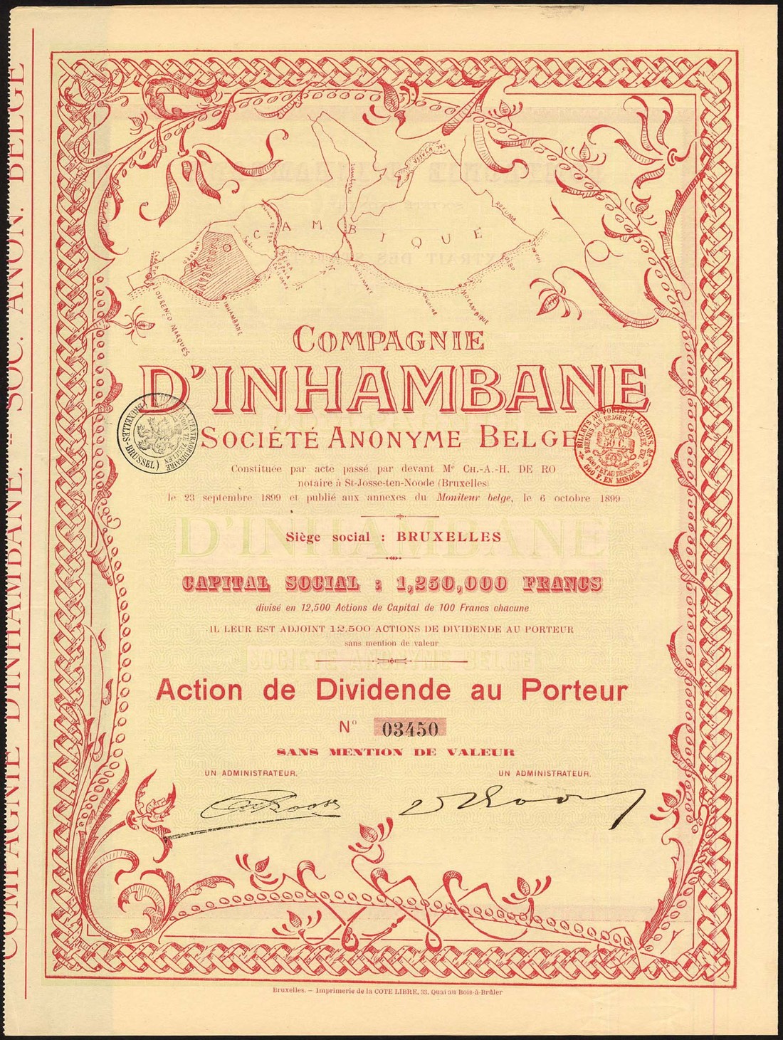 Mozambique: Compagnie d'Inhambane, a group of 17 certificates for dividend shares, Brussels 1899, map of the country at top showing the location of Inhambane between Beir and Lourenco Marques, red, yellow underprint, with coupons, one or two with edge nicks but generally very fine to extremely fine. (17)