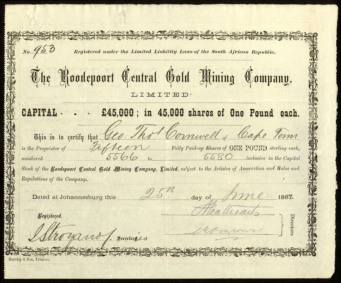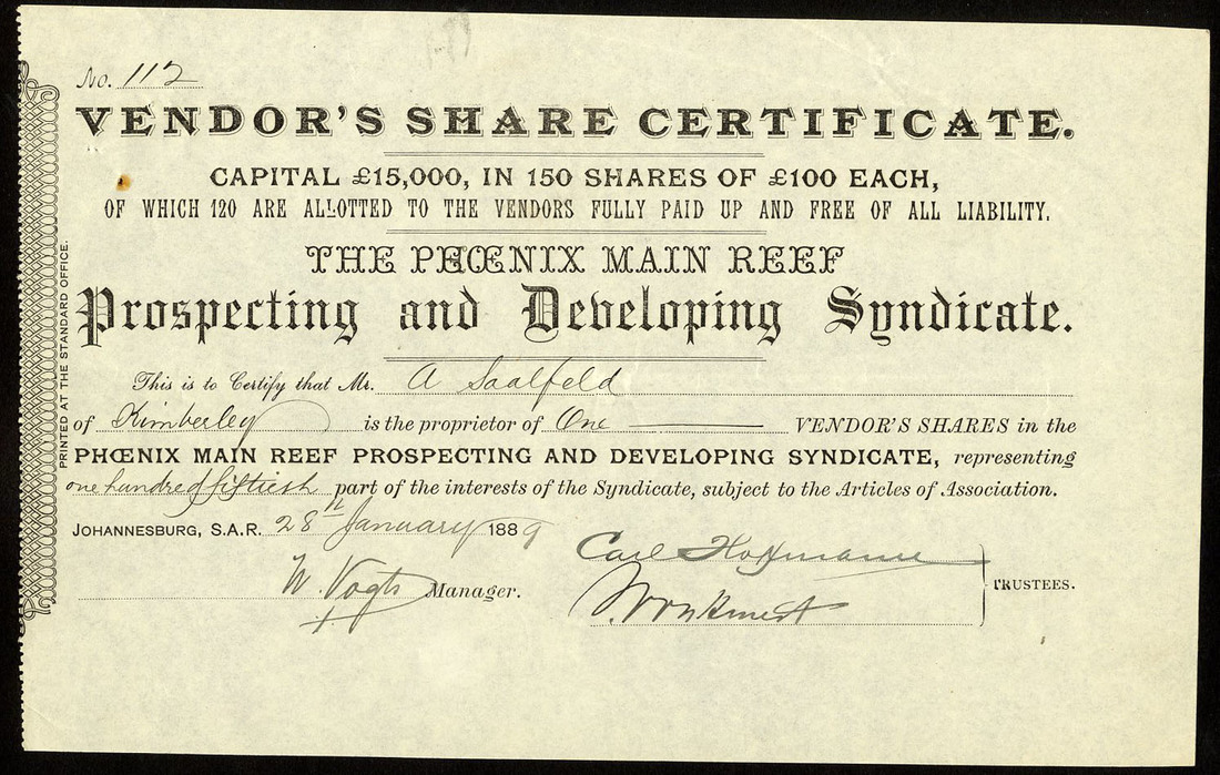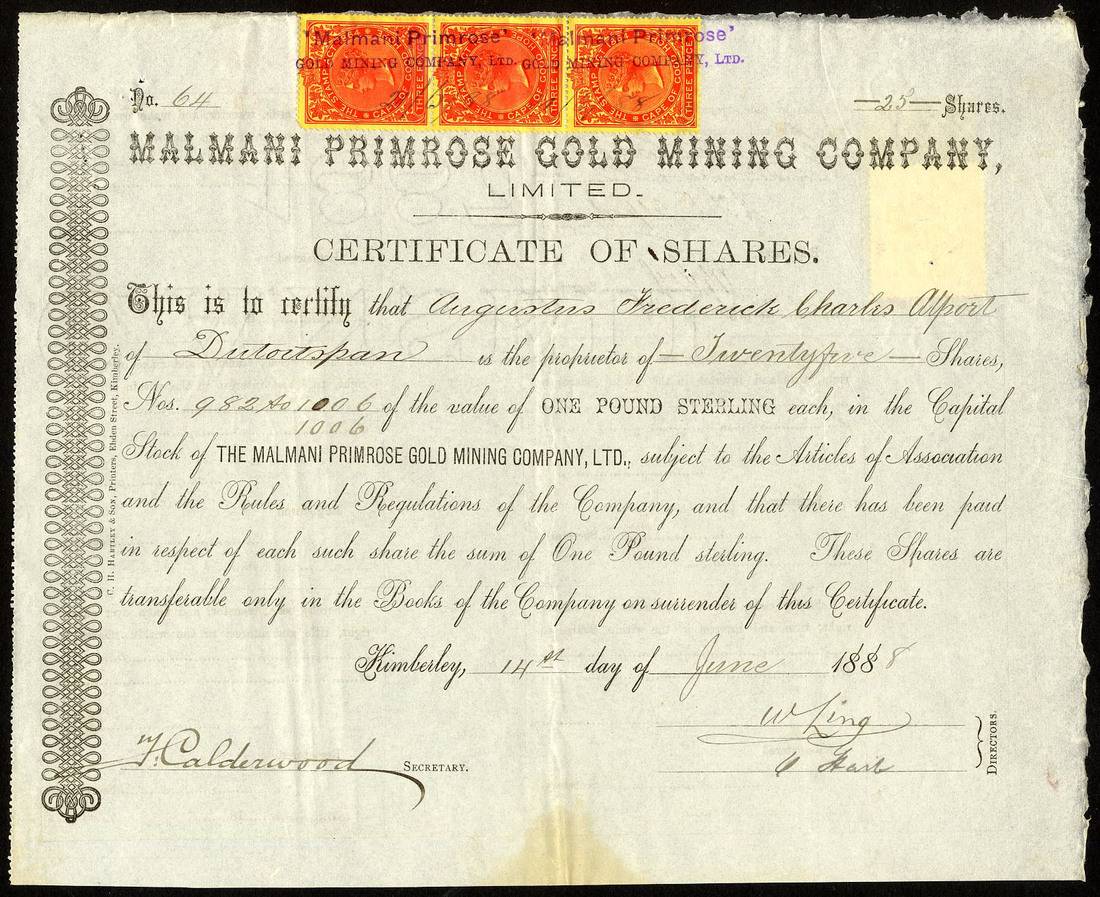 A group of early gold mining certificates comprising Louise Gold Mining Co. Ltd., 188[9]; Phoenix Main Reef Prospecting and Developing Syndicate, 188[9]; Roodepoort Central Gold Mining Co. Ltd., 1887; Malmani Primrose Gold Mining Co. Ltd., 188[8]; Belfast Gold Mining Co. Ltd., 188[6]; O'Dowd's Reef Gold Mining Co. Ltd., 188[8]; Du Preez Gold Mining & Estate Co. Ltd., 188[9]; Central Montrose Estate & Gold Mining Co. Ltd., 18[90] and Golden Snake and Abbotsford Ltd., 18[89], mostly very fine, some better and an interesting lot. (9)