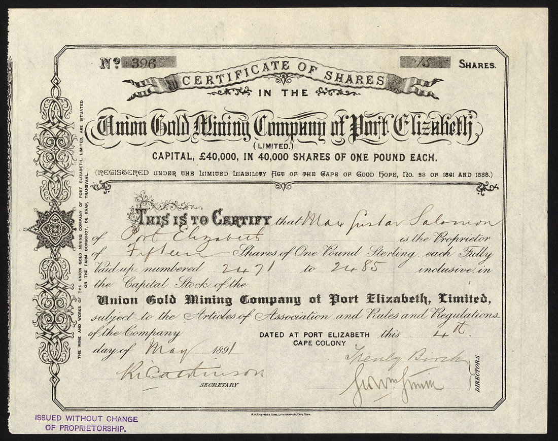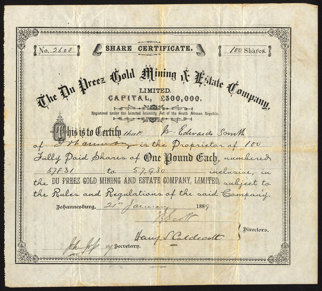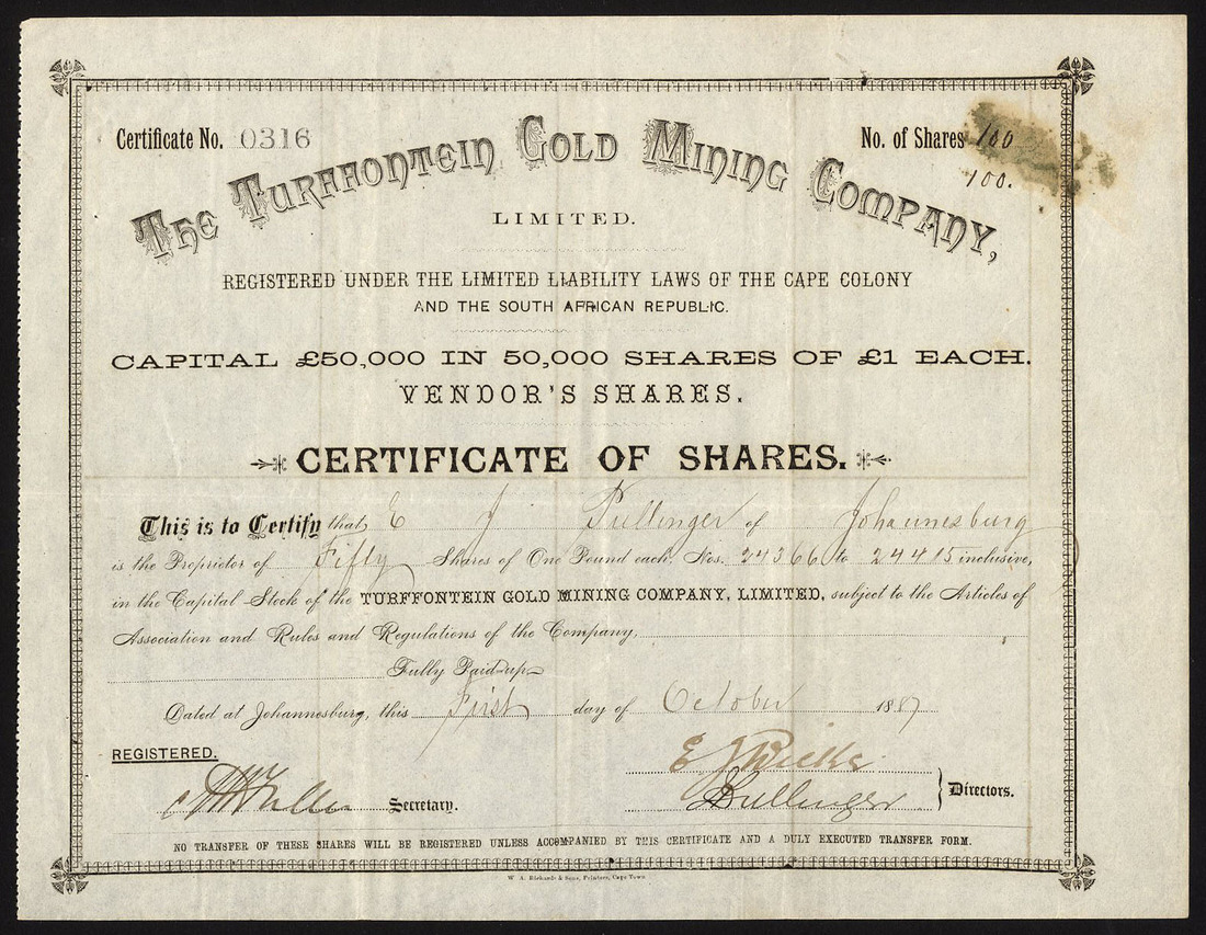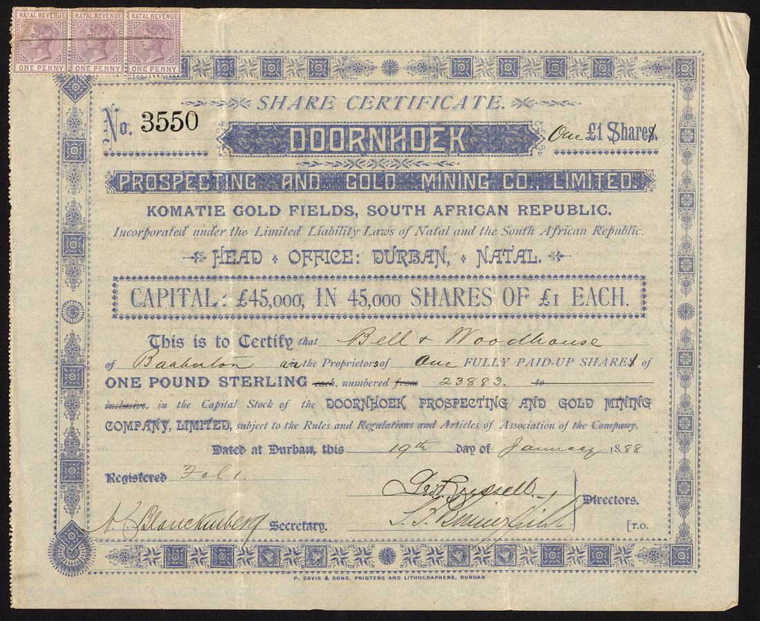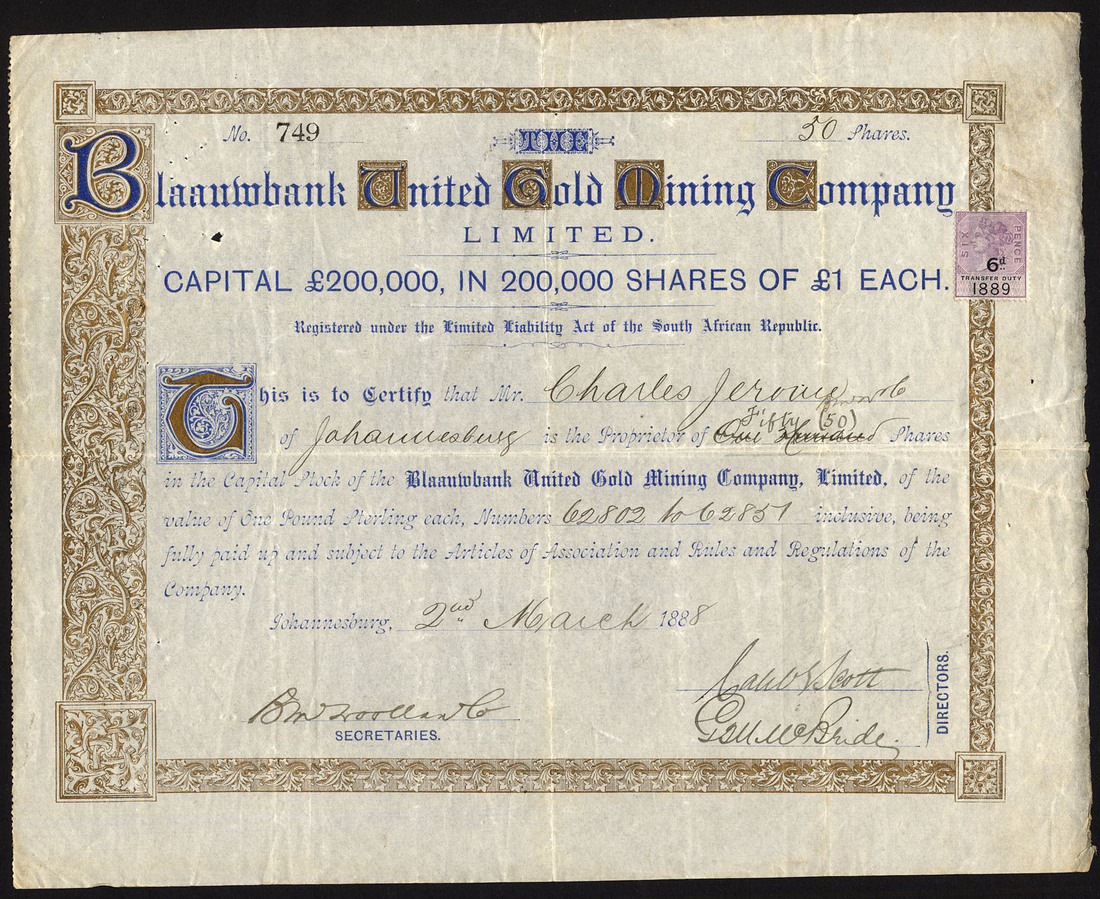 An attractive group of early locally registered gold mining companies comprising Blaauwbank United Gold Mining Co. Ltd., 1888; Doornhoek Prospecting and Gold Mining Co. Ltd., 1888; Du Preez Gold Mining & estate Co. Ltd., 1889; Hotspur Gold Mining and Developing Syndicate, 1889; New Callao and Trojan Consolidated Co. Ltd., 1887; Republic Gold Mining Syndicate Ltd., 1887; Turffontein Gold Mining Co. Ltd., 1887; Union Gold Mining Company of Port Elizabeth Ltd., 1891; Welgegund Prospecting and Developing Syndicate, Klerksdorp, 1889, and West Griqualand Mining Association, 1887, fine to very fine, a couple better, a few scarce. (10)