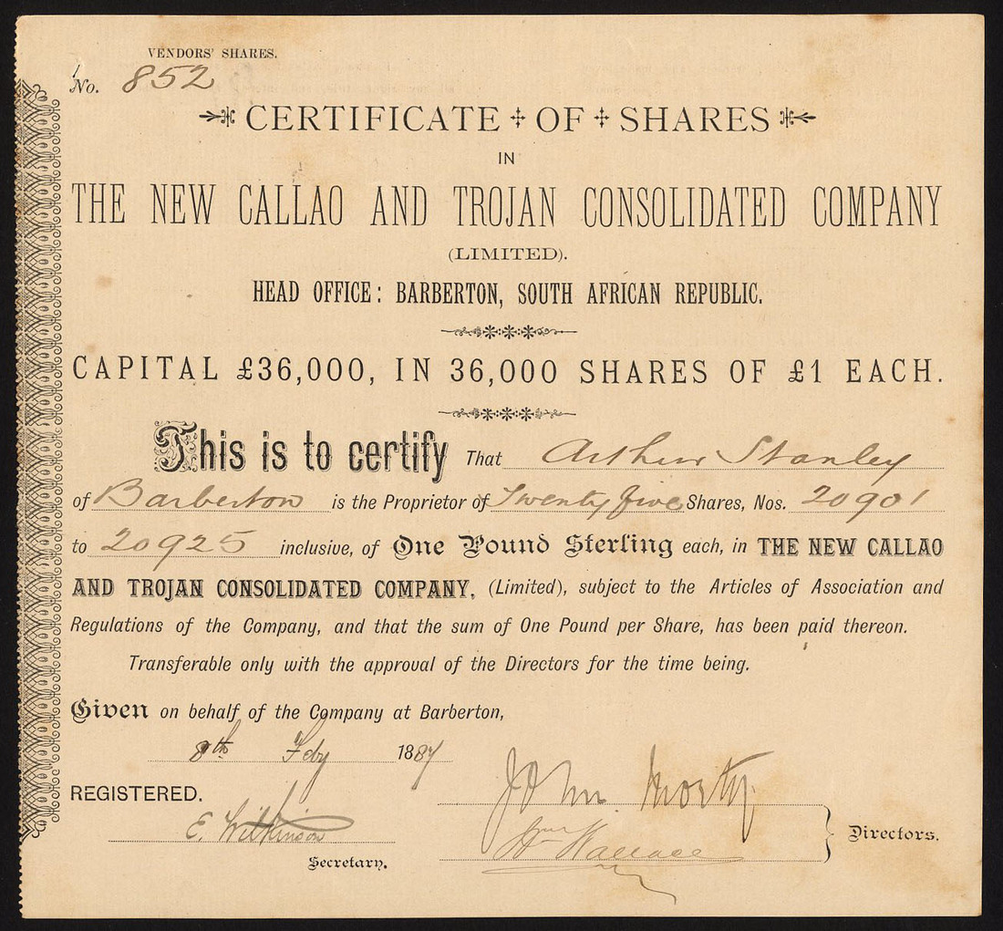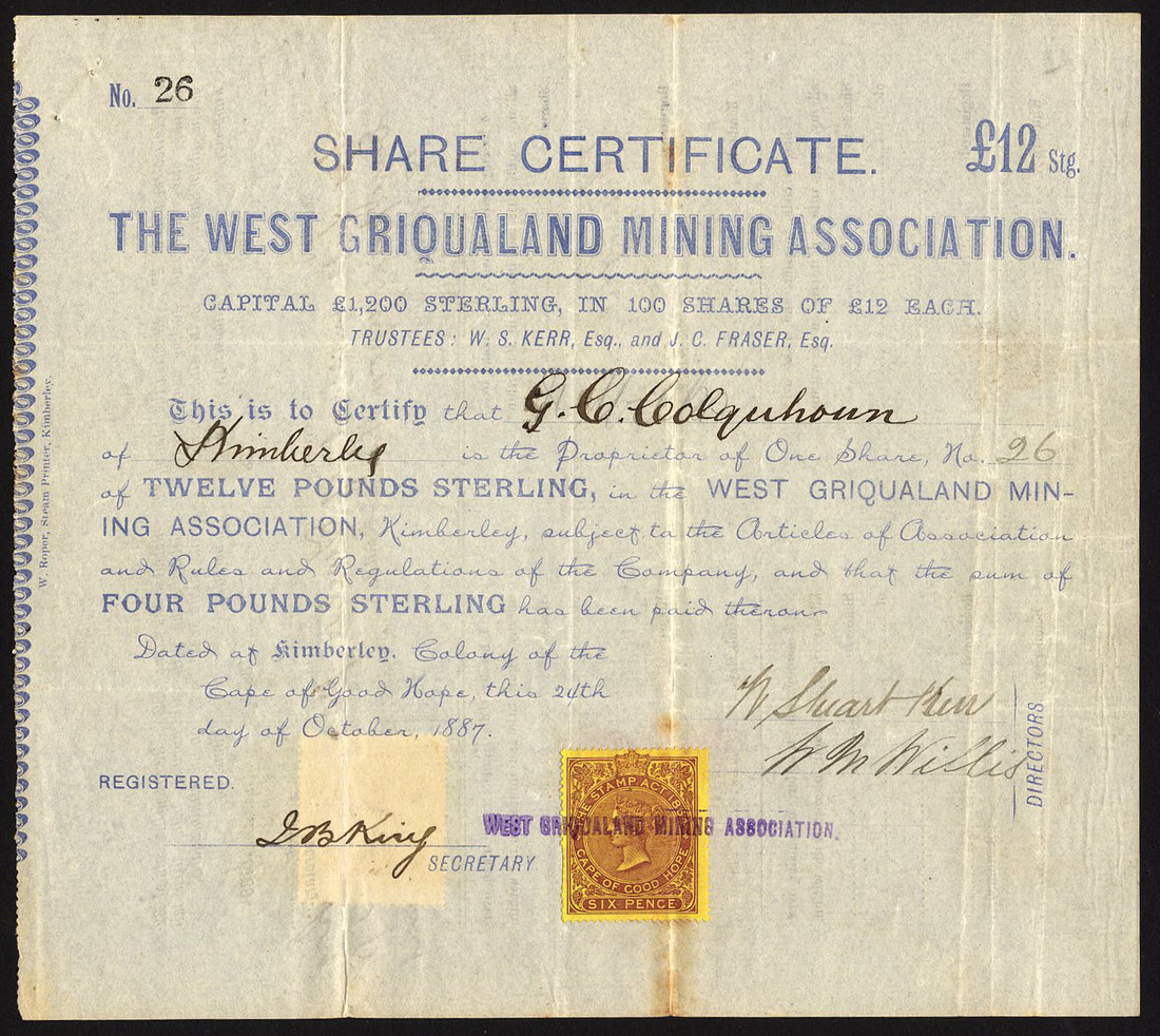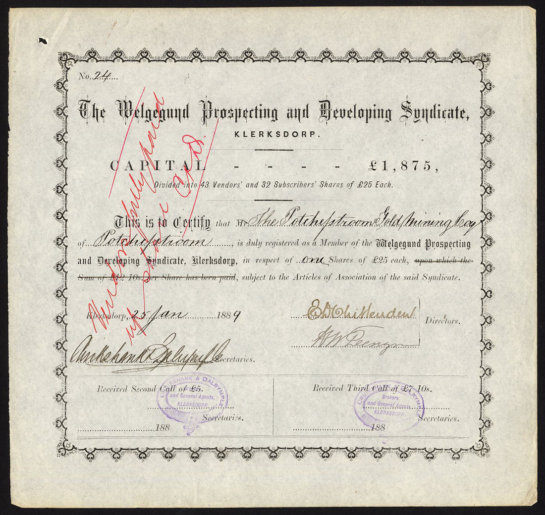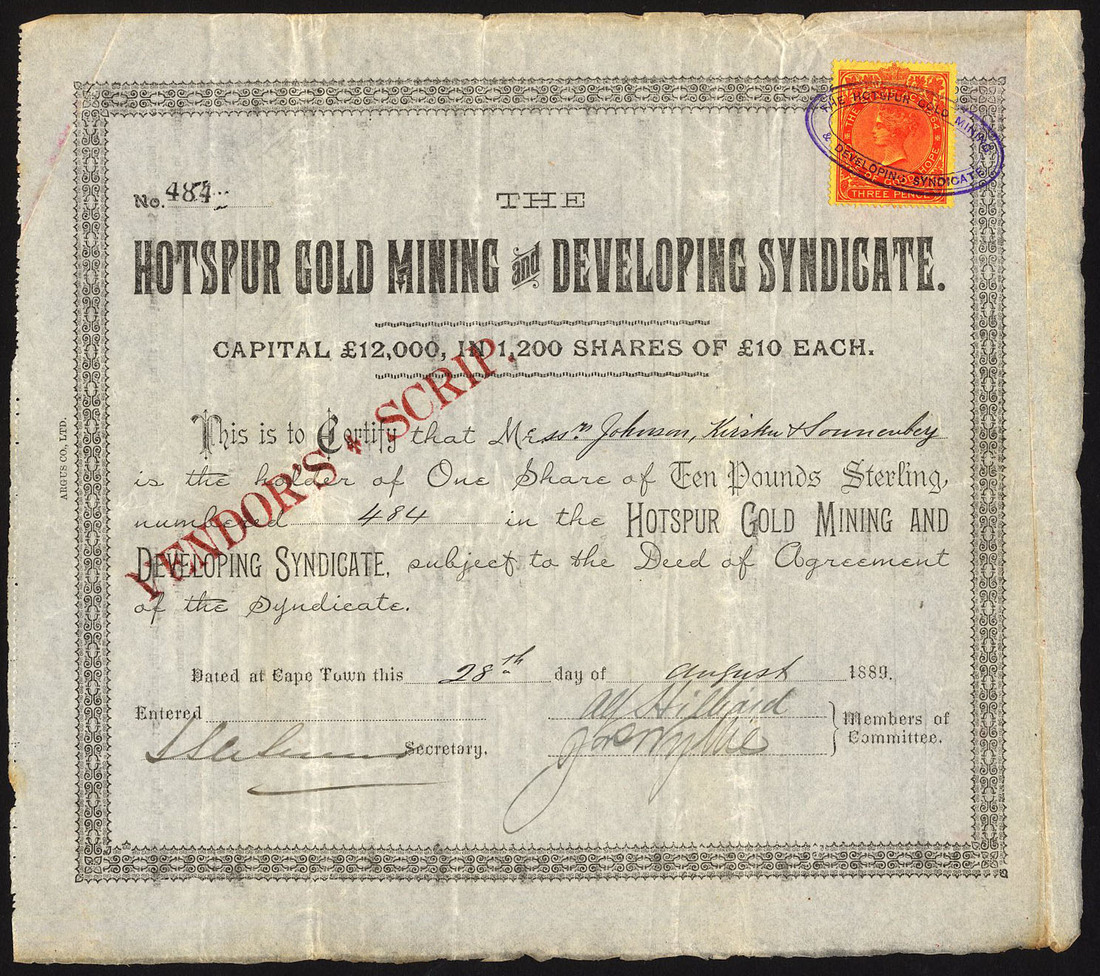 An attractive group of early locally registered gold mining companies comprising Blaauwbank United Gold Mining Co. Ltd., 1888; Doornhoek Prospecting and Gold Mining Co. Ltd., 1888; Du Preez Gold Mining & estate Co. Ltd., 1889; Hotspur Gold Mining and Developing Syndicate, 1889; New Callao and Trojan Consolidated Co. Ltd., 1887; Republic Gold Mining Syndicate Ltd., 1887; Turffontein Gold Mining Co. Ltd., 1887; Union Gold Mining Company of Port Elizabeth Ltd., 1891; Welgegund Prospecting and Developing Syndicate, Klerksdorp, 1889, and West Griqualand Mining Association, 1887, fine to very fine, a couple better, a few scarce. (10)