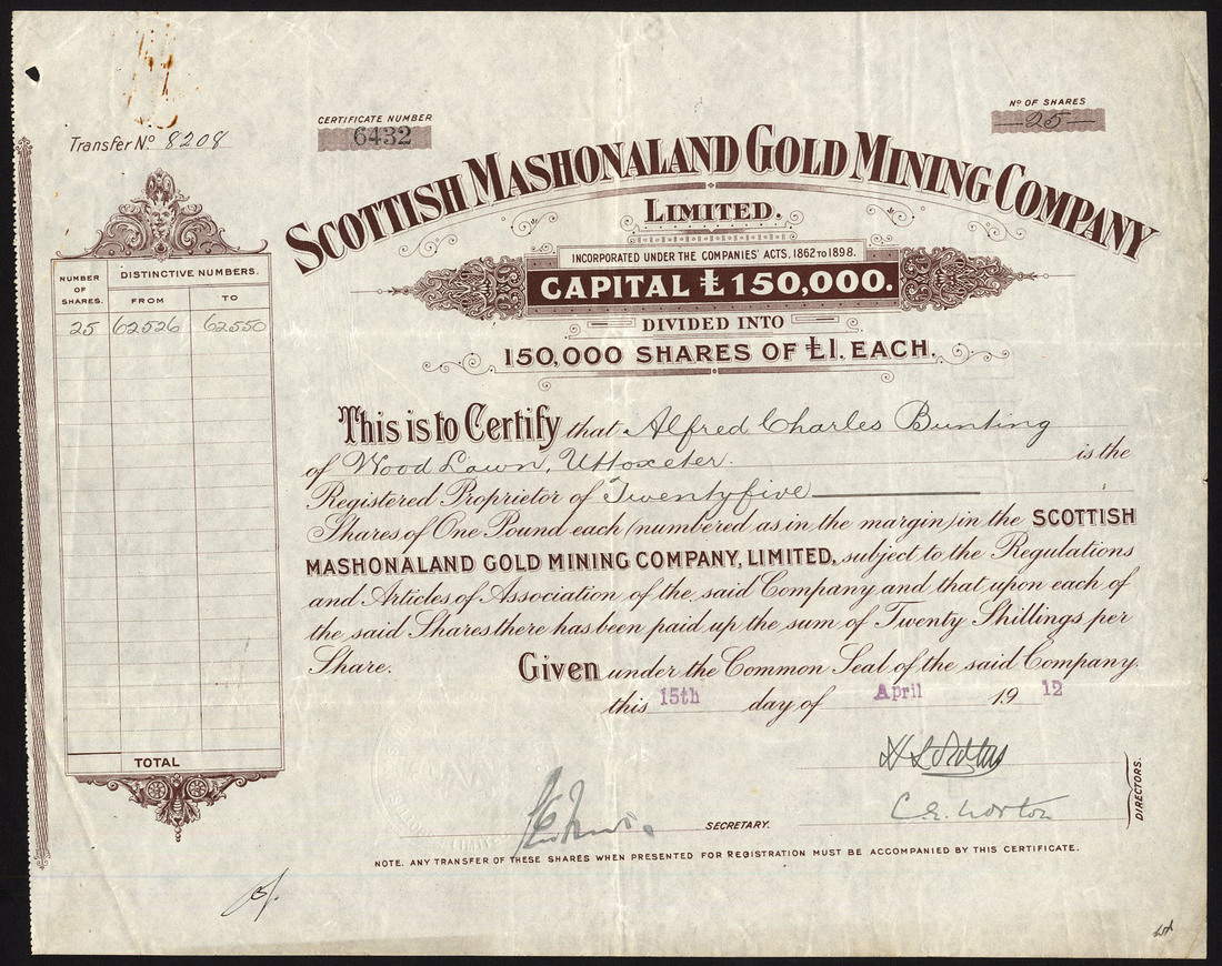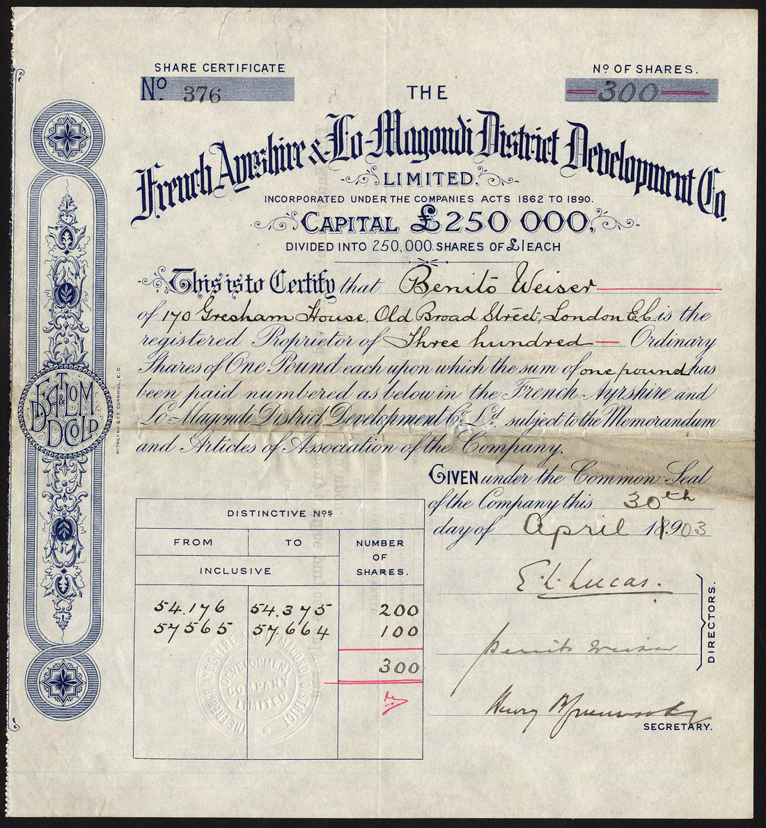 A collection of 36 Rhodesian mining certificates, all different, 1890's through to 1930, some better pieces noted, mixed condition, mostly fine to very fine, a few better. (36)