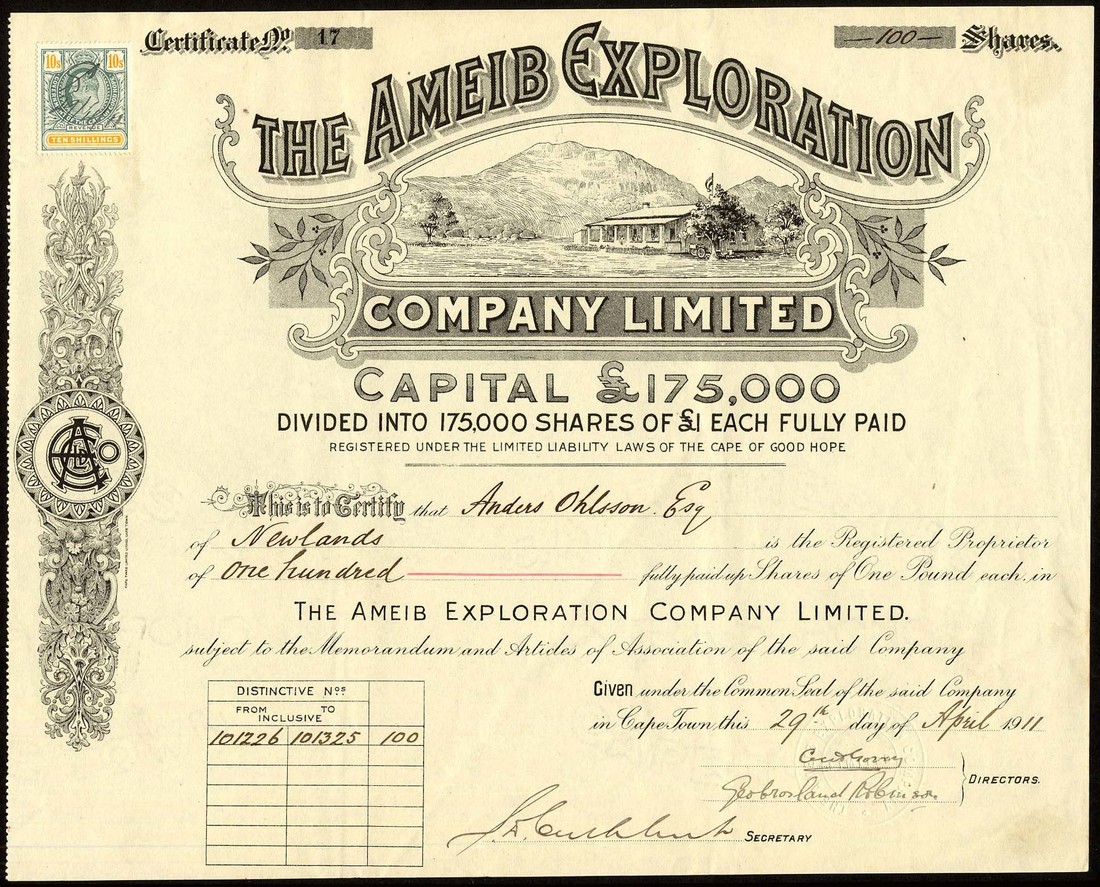 Ameib Exploration Company Ltd., £1 shares, Cape Town 19[11], no.17, large vignette of mountain with ranch house in the foreground, affixed revenue stamp, about extremely fine
