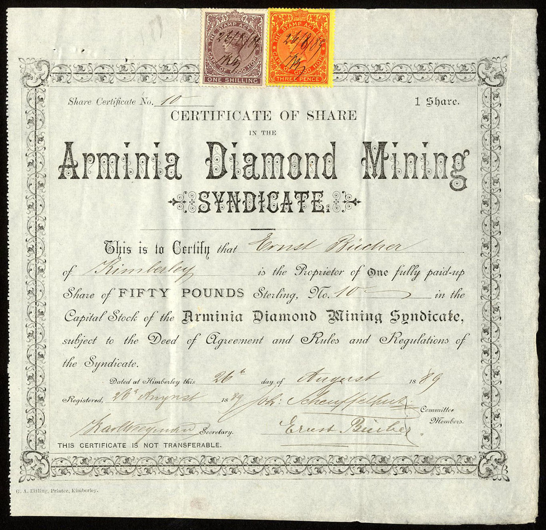 Arminia Diamond Mining Syndicate, £50 share, Kimberley 18[89], no.10, black, adhesive Cape revenue stamps at top, good very fine.