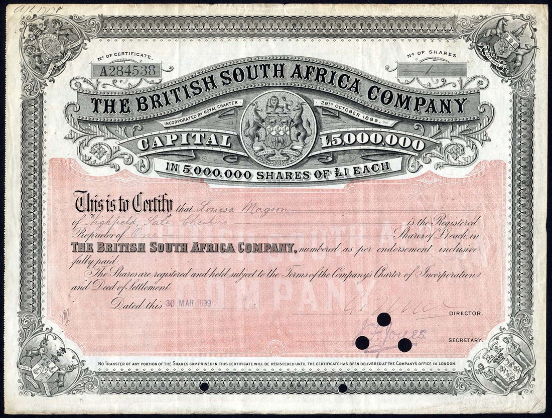 British South Africa Company, £1 shares, [1899], no.A284538, signed by Lord Gifford V.C. as director, coat of arms top centre, black, pink underprint, hole cancelled, very fine and rare early date.