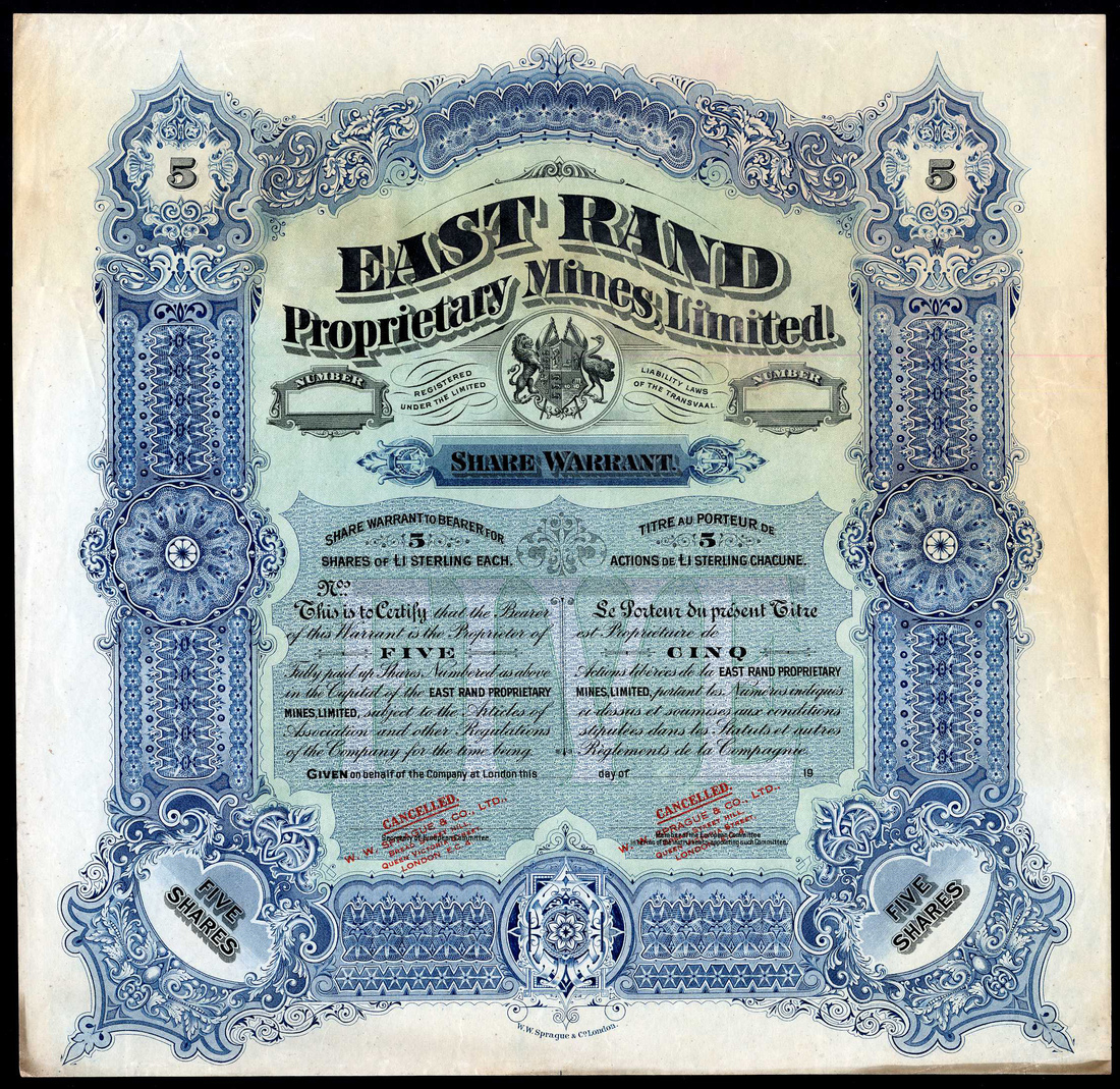 East Rand Proprietary Mines Ltd. (Transvaal), a specimen bearer warrant for 5 shares of £1, London 19- (circa 1910), large format piece with very ornate border coat of arms in centre, printed by W. W. Sprague & Co., blue and black, together with a specimen £1000 debenture, 1898, large format, green and black with pink underprint, both stamped cancelled/ w.w.sprague & co. ltd., slight discolouration but very fine and scarce. (2)