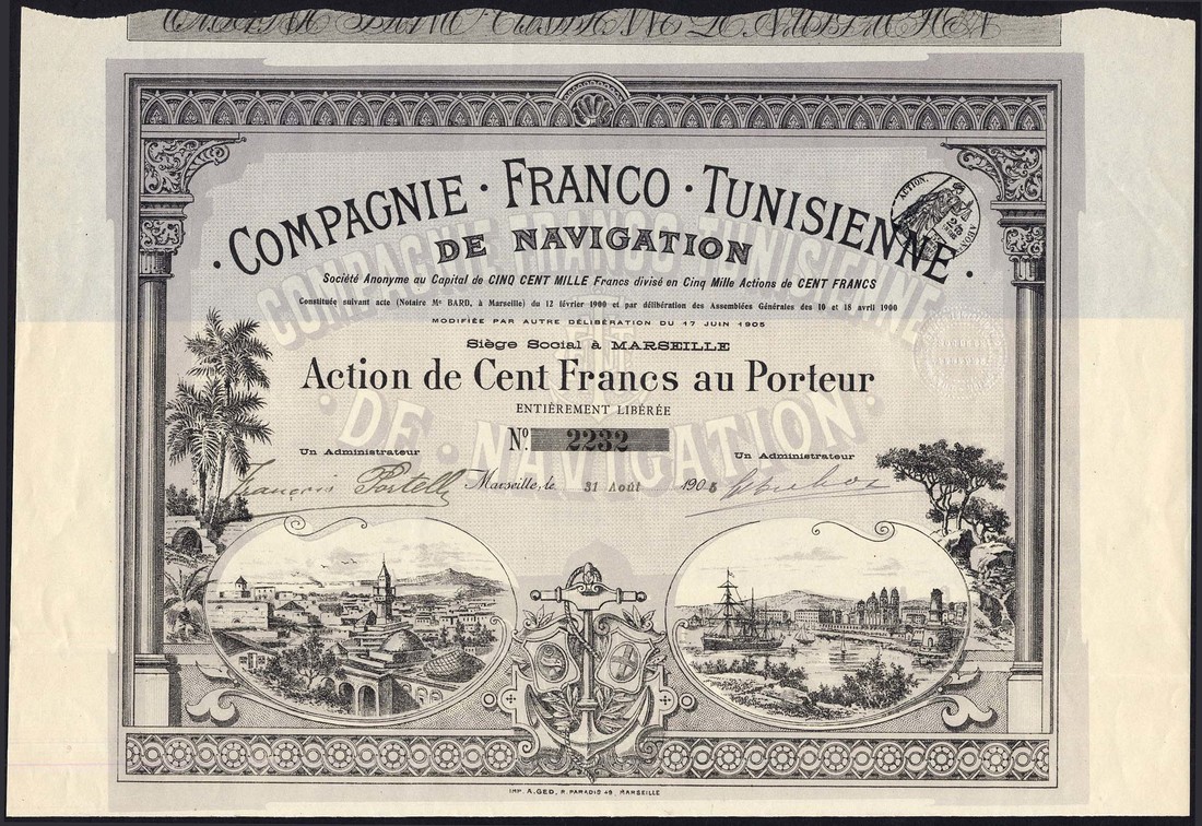 Compagnie Franco Tunisienne de Navigation, 100 franc share, Marseille 190[5], no.2232, attractive piece with architectural borders, North African city at bottom left, harbour scene at bottom right, black, pale mauve underprint, extremely fine.