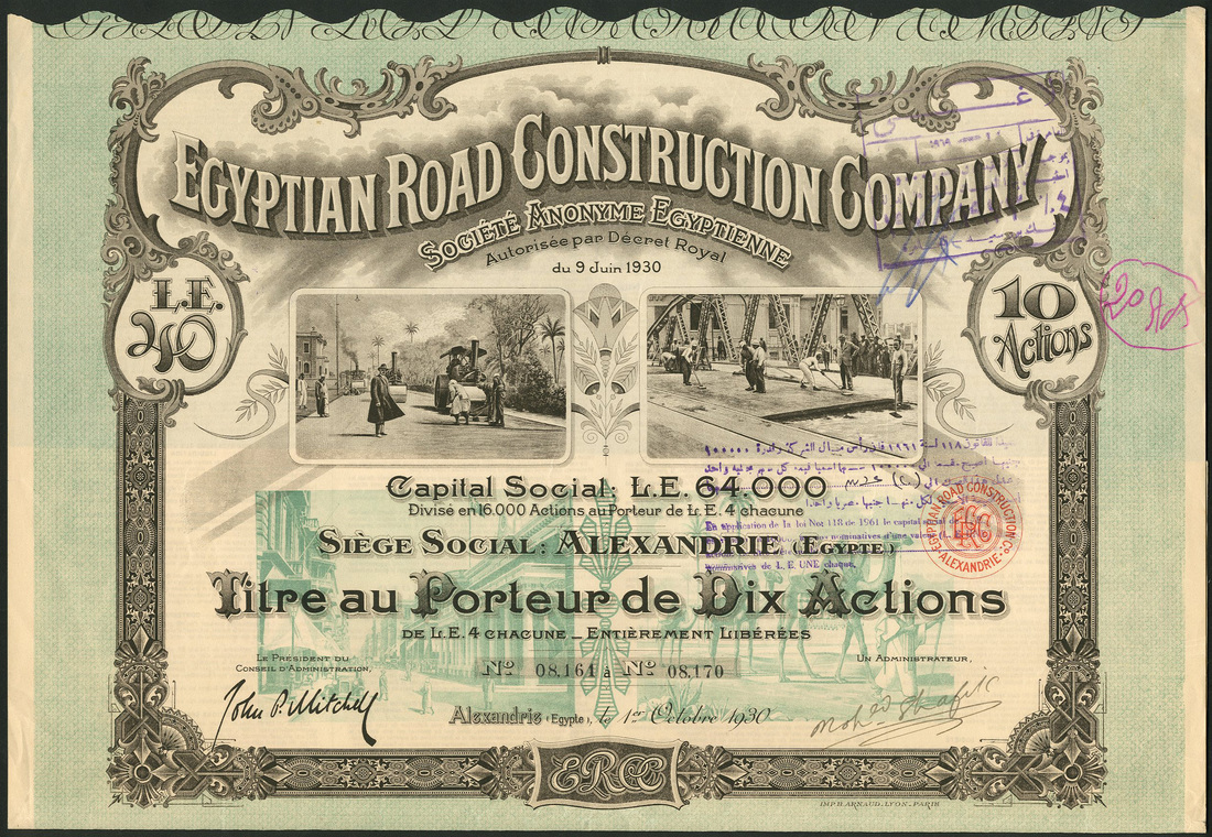 An attractive group of Egyptian certificates, comprising Egyptian Road Construction Co., 1930, vignettes of laying road surface; Banque Industrielle d'Egypte, 1899; Soc. Egyptienne d'Entreprises Urbaines & Rurales, 1905; Grand Garages d'Egypte, 2 different, both 1906; Wadi Kom-Ombo, 1905; Soc. Fonciere du Domaine de Cheikh Fadl, 1, 5, 10 and 25 shares, 1938; Fadlab Estate Grieve & Co., 1911; Cotton Export Coy. of Egypt, 1920; Egyptian Land Investment Co., £5 share and founders share, both 1905; Comptoir Financier & Commercial d'Egypte, 1906; Egyptian General Omnibus Co., 2 types, 1933; Societe des Terres Rares d'Egypte, 1931; Egyptian Perla Marble Co., 1931; Ameublement Krieger, 1923, and Societe Agricole de Kafr-El-Dawar, 2 types, both 1907, all very fine and better. (22)