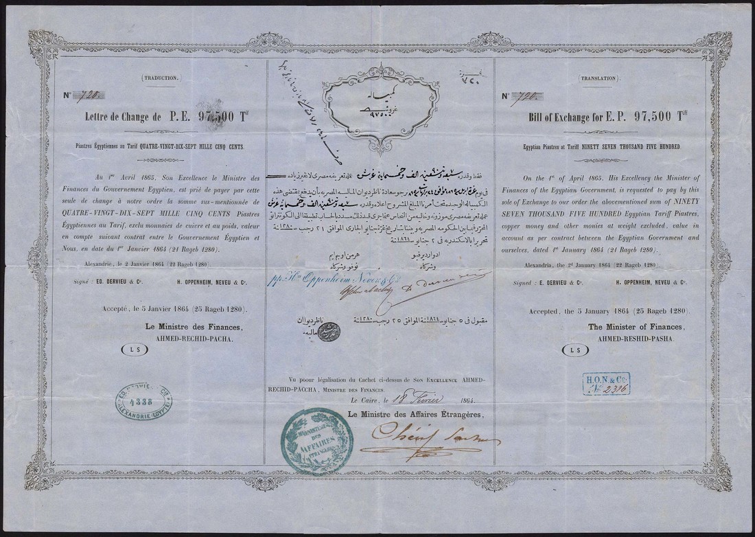 Egyptian Ministry of Finance, a sole bill of exchange for 97,500 piastres, 2nd January 1864, payable on the 1st April 1865, signed by Ahmed-Rechid Pacha, Minster of Finance, also by bankers E. Dervieu & Co and H. Oppenheim, Neveu & Co., large format, text in French, Arabic and English, black on grey paper, endorsements on reverse passing through several hands until accepted by Mayer D'Angeli on 29th March 1865, an excellent example of Egyptian short term borrowing, very fine.