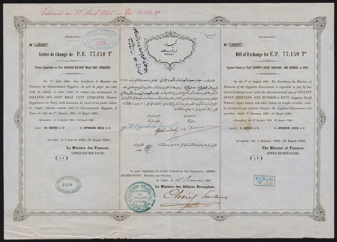 Egyptian Ministry of Finance, a sole bill of exchange for 77,150 piastres, 2nd January 1864, payable on the 1st August 1865, signed by the Minister of Foreign Affairs in Cairo, large format, text in French, Arabic and English, black on grey paper, endorsements on reverse to the Suez Canal Company and signed by its agent Mr. Vernoni, an excellent example of Egyptian short term borrowing, very fine.