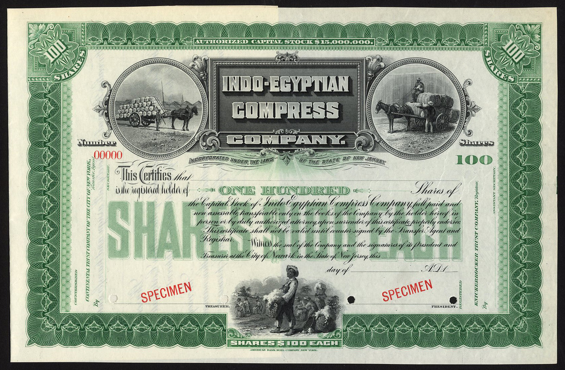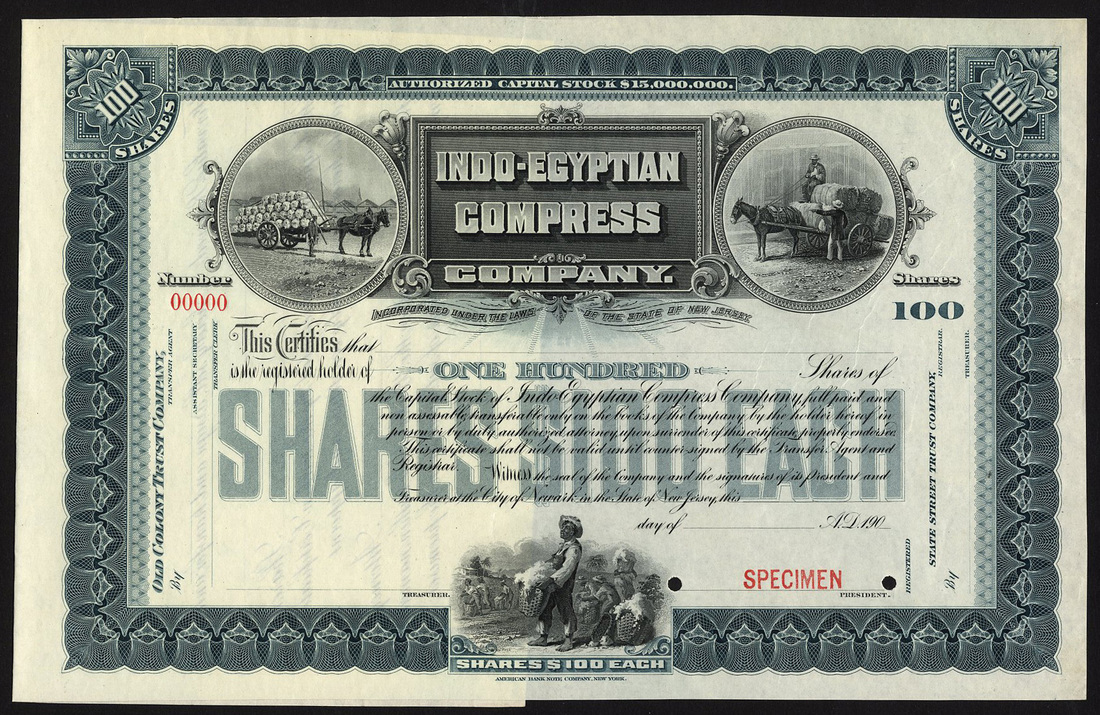 Indo-Egyptian Compress Company, a pair of specimen certificates, from the American Bank Note Co. archives, both for 100 shares of $100, one to be countersigned by Continental Trust and the other by Old Colony Trust, cotton pickers at bottom, loaded wagons at either side of title, green, circa 1899 and blue-grey, circa 1900 respectively, with counterfoils, both overprinted SPECIMEN in red, extremely fine. (2)